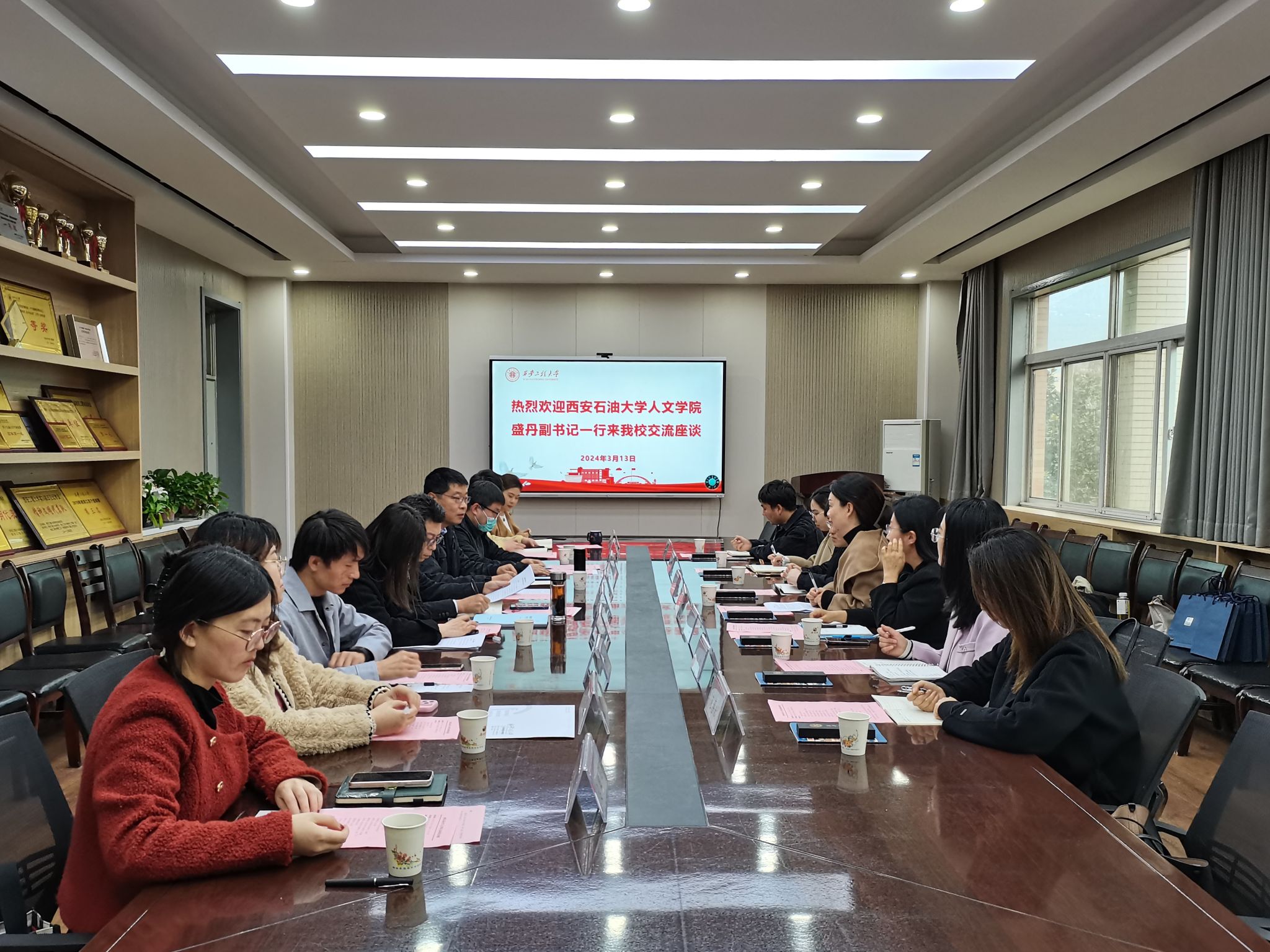 赵立涛代表两院学工队伍对盛丹一行表示热烈欢迎。随后赵文熙和赵立涛分别从必赢官网整体人文学科的历史沿革、学院学生工作模式、促进学生全面发展探索等对必赢官网两个学院做了介绍。盛丹详细阐述了西安石油大学大学人文学院从成立至今的发展历程以及在文科学生培养、就业方面的改革经验。