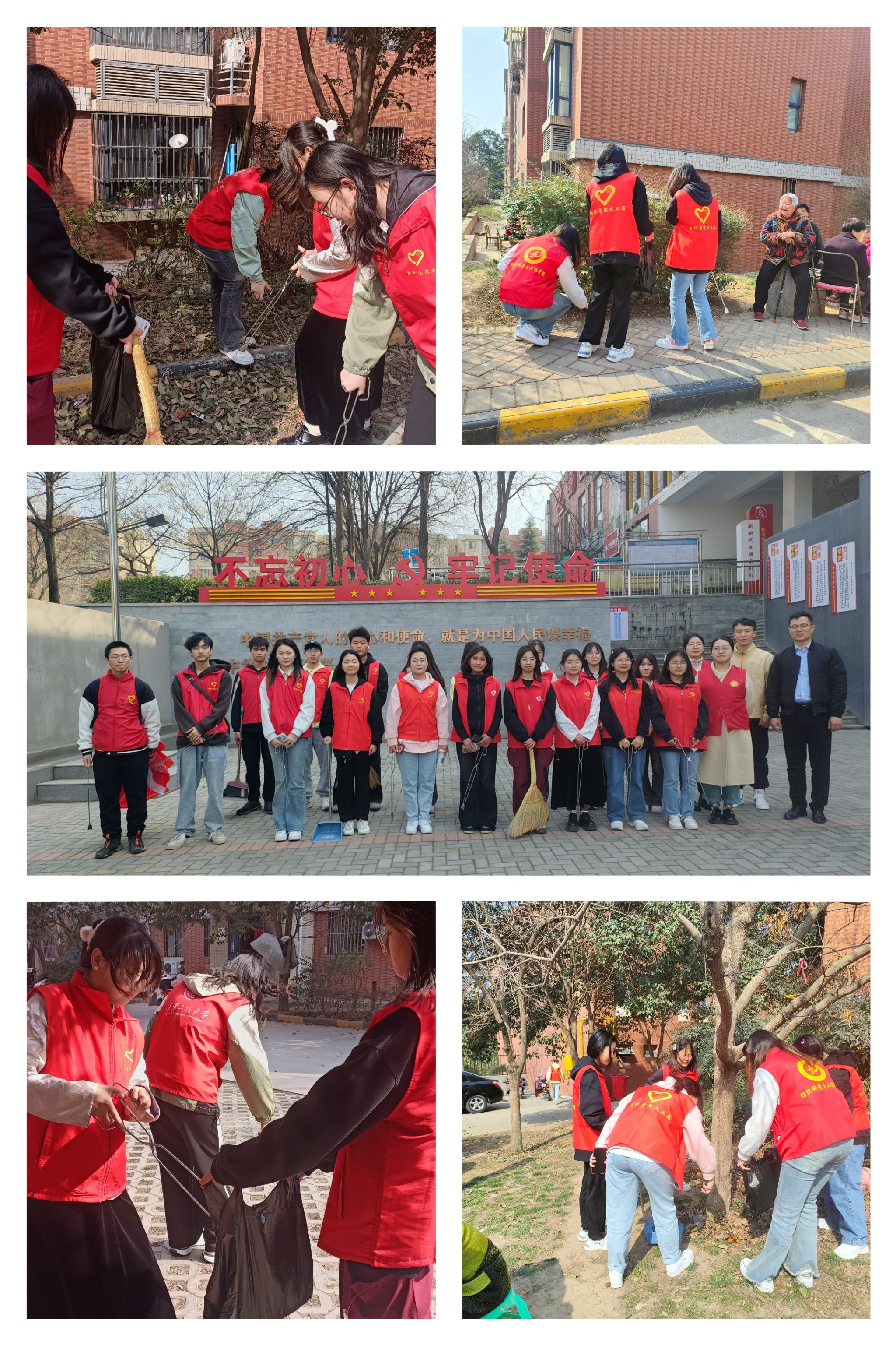宣讲活动后,两个学院的团员青年与社区工作人员一同开展了社区卫生清洁志愿服务活动。团员青年们身着红马甲,手拿扫帚、垃圾钳和垃圾袋,两两合作,在社区内开展垃圾清扫活动,同时对老年人经常活动场地的安全隐患进行了排除和清理。在大家共同的努力下,社区环境焕然一新。