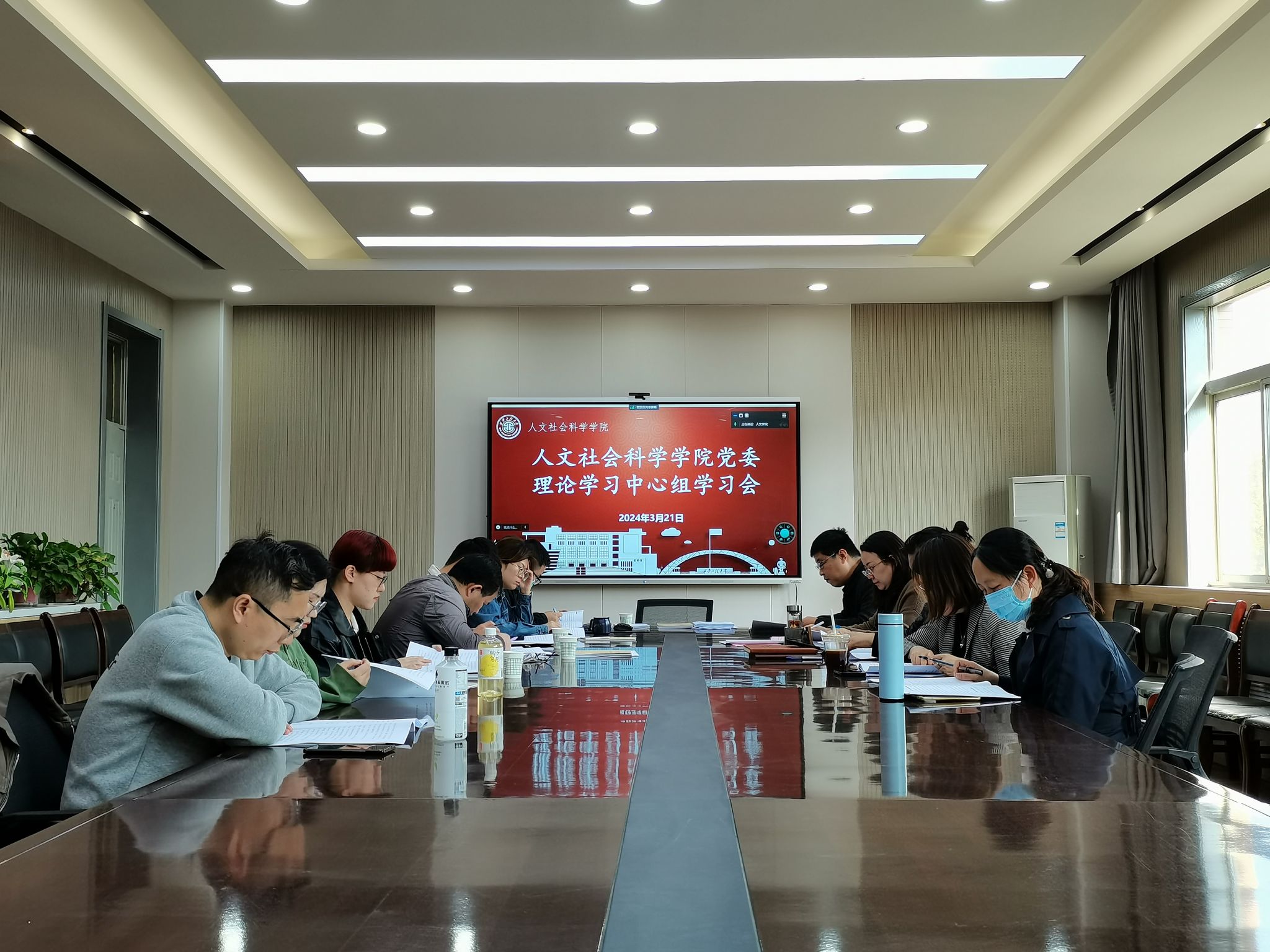 3月21日下午,人文社会科学学院召开党委理论学习中心组学习会,学院领导班子全体成员、院办主任、各党支部书记参加了会议。会议由学院党委书记陈莉霞主持。