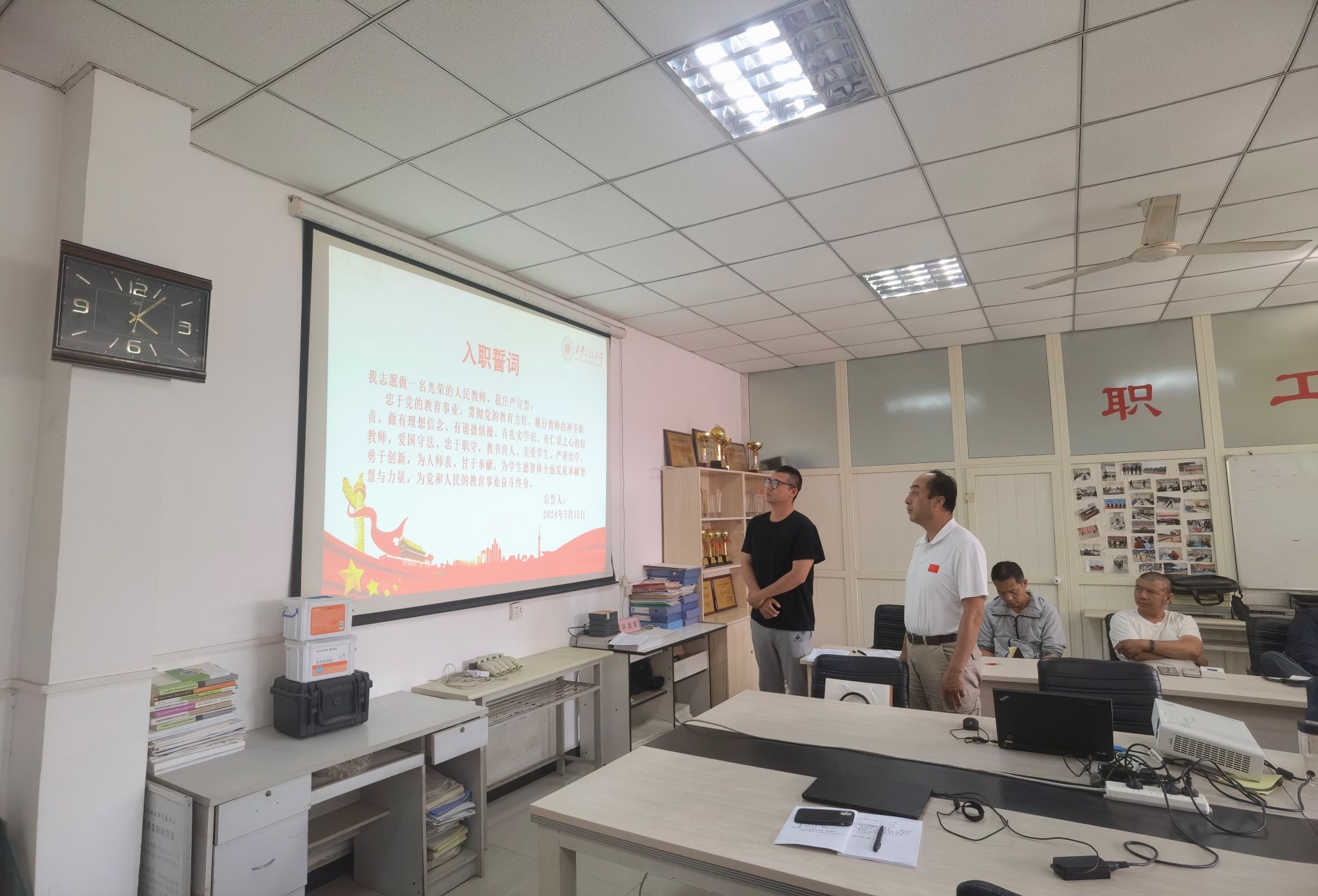 其次,举行新进教师王伟东入职宣誓仪式。副主任李志翔领誓,王伟东宣誓,做到忠于党的教育事业,贯彻党的教育方针,履行教师的神圣职责,做有理想信念、有道德情操、有扎实学识、有仁爱之心的好教师。紧接着王伟东做个人师德师风学习专题汇报,从自身学习的内容讲解到个人对于体育教师师德师风建设的五点理解,并针对自身工作从思想、教学、运动训练、科研四个方面进行了三年规划汇报。