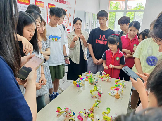 实践环节中,同学们主动与小朋友组成5人小组,依次领取制作小老虎面花所需的材料并按照王鑫老师讲解的制作步骤和创作要点进行面花制作,有的捏头、有的捏身体、有的捏尾巴,同学之间分工明确、相互配合,在短时间内捏出自己预想的形状,接着进行上色、组装,一个独具一格的面花作品便呈现在大家眼前,让同学们不禁赞叹面花的魅力。