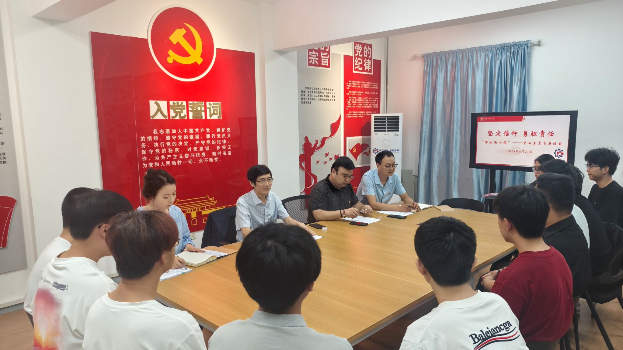 为充分了解2024届毕业生现状,广泛听取毕业生对学校和学院发展建设、教育培养、管理服务等方面的意见和建议,6月21日上午,机电工程学院在“先锋机电五星空间”党建引领“一站式”学生社区党建活动室开展“坚定信仰、勇担责任”2024届毕业生党员座谈会。学院党委书记阚佩、党委副书记冯翊、组织员秦方刚、毕业生辅导员李菁菁及2024届毕业生党员代表参加了本次座谈会。