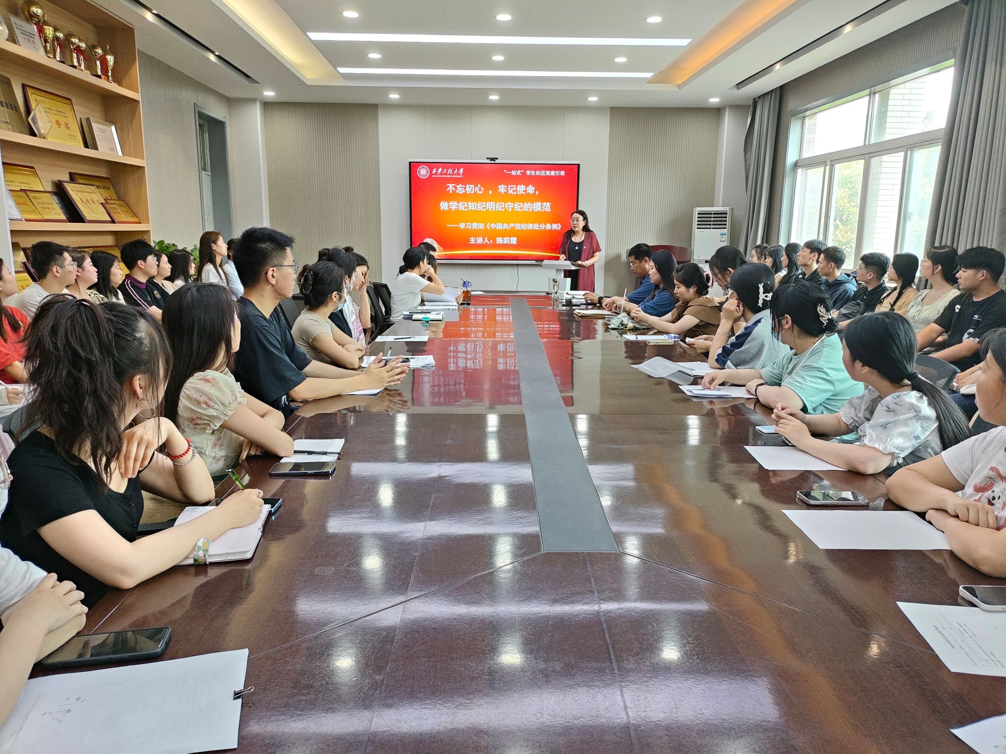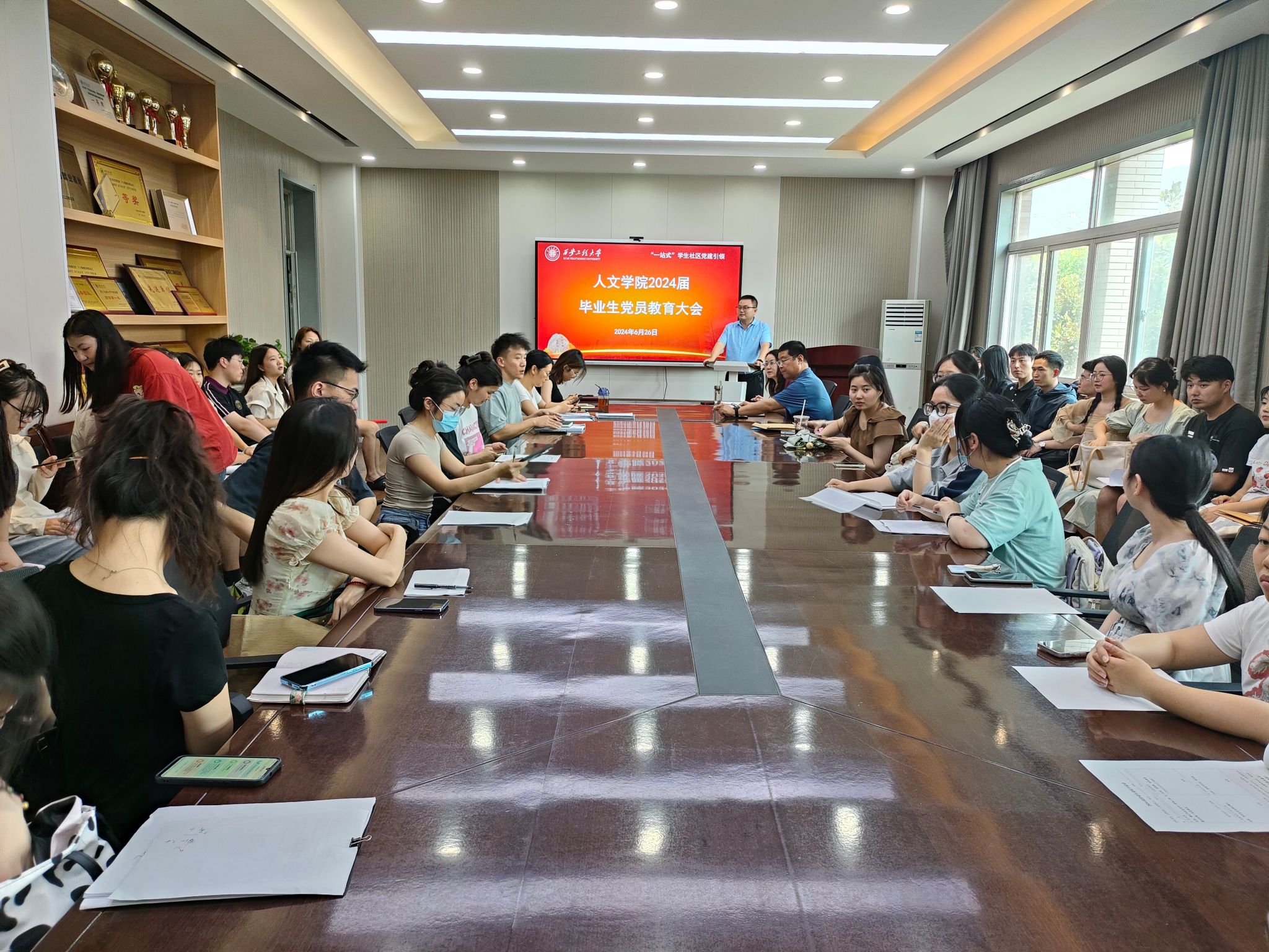 盛夏时节,毕业在即。6月26日下午,人文社会科学学院于临潼校区人文楼326会议室举行“一站式”学生社区“党建引领”——2024届毕业生党员教育大会。人文学院党委书记陈莉霞、党委副书记赵立涛、各学生党支部书记及全体毕业生党员参会。会议由学院组织员王德利主持。