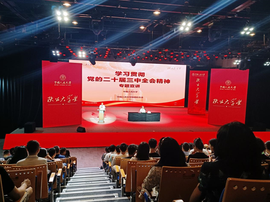 著名经济学家、中国人民大学一级教授、教育部“长江学者奖励计划”特聘教授杨瑞龙在会上做了题为《坚持社会主义市场经济改革方向》的专题宣讲。他从全面深化改革推进中国式现代化、构建社会主义市场经济体制是全面深化改革的重要依托、构建高水平社会主义市场经济体制等方面,系统阐述了构建社会主义市场经济体制在全面深化改革中的重要地位,并对中国特色社会主义市场经济体制的形成过程及其独特特征进行了深入探讨。他用深入浅出、通俗易懂的语言深入阐释全会精神,在宣讲过程中既有深入的理论分析又有鲜活的真实案例,把全会精神的学习宣传引向深入。杨教授强调,构建高水平社会主义市场经济体制是我们当前及未来的一项核心任务,各高校要认真领会二十届三中全会精神,产出更多高质量的研究成果。