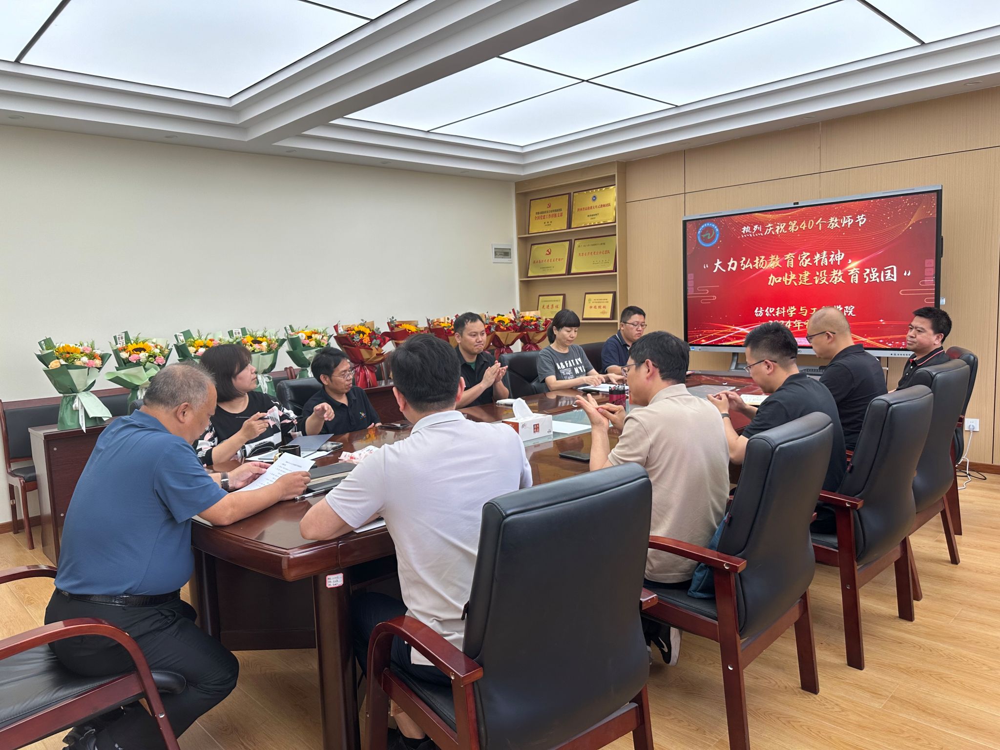 举办感恩教师主题活动。在9月9日上午的座谈会上,学院向近一年做出突出贡献的教师代表和新入职教师赠送鲜花,他们分别是:中国纺织工业联合会“科技进步一等奖”和2024年国家自然科学基金“面上项目”获得者樊威教授;中国纺织工程学会“纺织科技成果转化贡献奖”和2024年“纺织之光”教师奖获得者陆少锋教授;陕西省“科技进步二等奖”和2024年“纺织之光”教师奖获得者徐成书教授;第二批“国家级一流本科课程”获得者谭艳君教授级高工;2024年国家自然科学基金“面上项目”获得者支超副教授;陕西省创新人才攀登工程“青年科技新星”入选者姚一军副教授,以及新入职教职工乔曦冉、魏笑笑、龙晶、刘赋瑶、洪小洋。