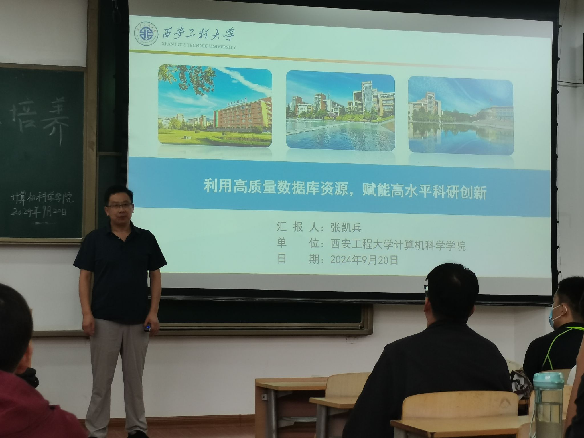 随后,张凯兵作了题为《利用高质量数据库资源,赋能高水平科研创新》的主题报告。报告从高质量学术资源的内涵分析、高水平创新成果的内涵分析、学术资源助力高质量论文写作和科研路上的几点建议四个方面深入剖析了高质量学术资源在研究生科研过程中的重要作用,讲解了如何有效利用这些资源助力高水平科研成果产出。他还分享了计算机科学前沿进展、发展趋势,为学生们提供了宝贵的专业科技前沿信息。在谈到课题组的研究情况时,他介绍了当前学院各课题组的组成情况、主要研究方向、取得的重要成果和未来改革发展的规划等。他鼓励学生们积极参与课题组的科研工作,通过科研实践来提升自己的科研能力,为将来升学就业做好内涵准备。