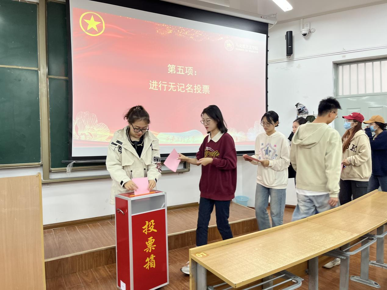 大会在庄严的国歌声中拉开了序幕。傅博娜老师宣读了大会选举办法,介绍了选举工作相关情况及候选人基本情况,通过了大会选举监票人和计票人。随后,大会按照选举办法,经过清点到会人数、发放选票、无记名投票、计票等程序,成功选举出李斌等三人校团代会代表、乔秀洁等三人校研代会代表。大会圆满完成各项议程后,在中国共产主义青年团团歌中落下帷幕。