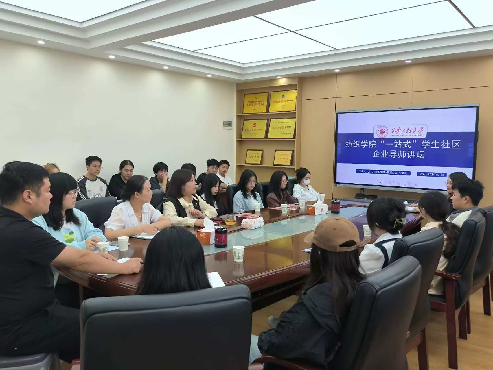 10月18日下午,纺织科学与工程学院邀请企业导师、河北宇腾羊绒制品有限公司行政副总宁盈盈一行3人,走进“一站式”学生社区开展“企业导师讲坛”活动,与学生座谈交流、分享经验。学院党委副书记朱宇军、学工办主任姚婕、辅导员邓恩征、刘要和20余名河北籍学生代表参加了会议,会议由学院党委副书记朱宇军主持。