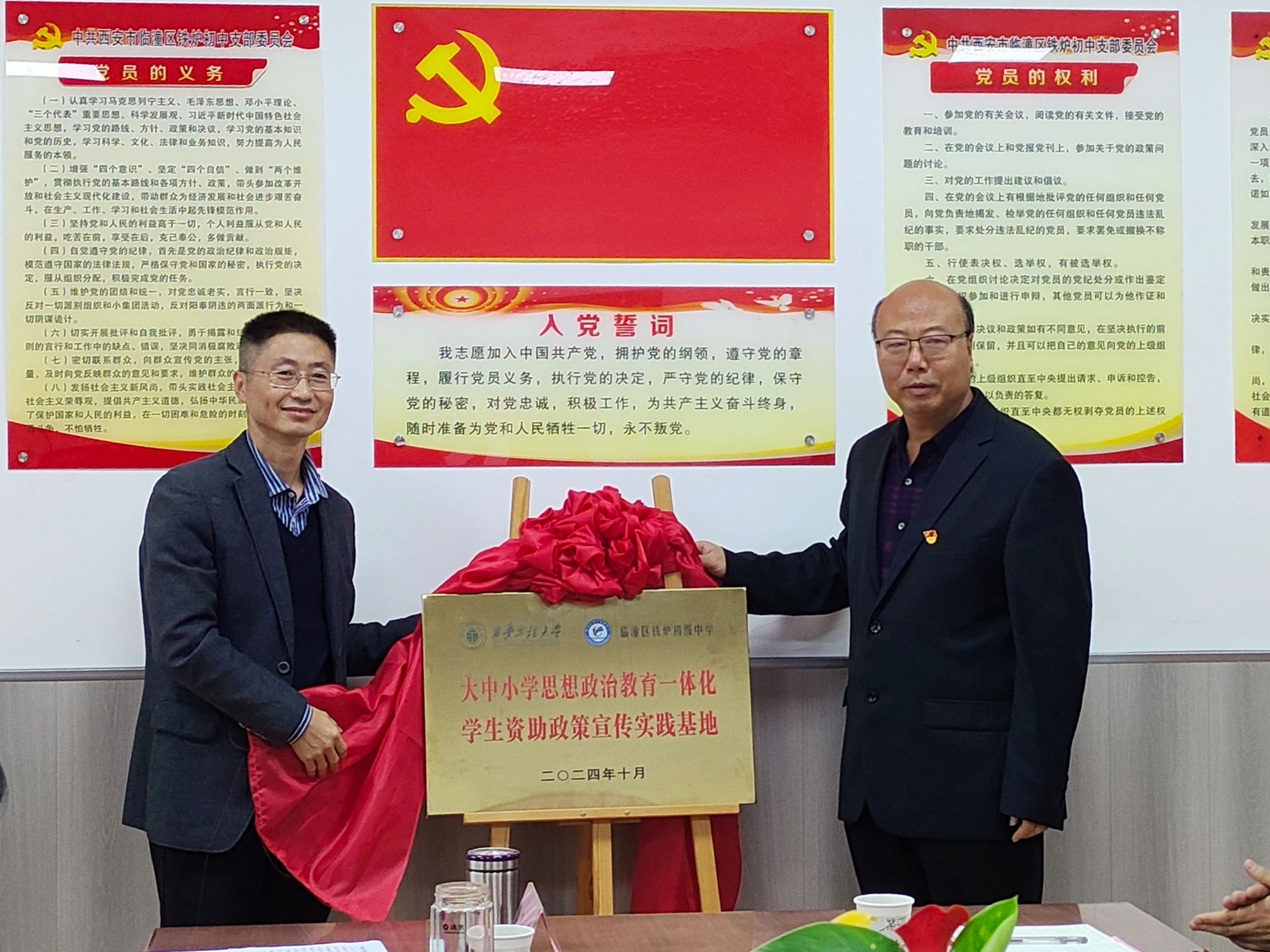 赵宏代表必赢官网向铁炉初级中学捐赠价值1万元的文具用品。杨小峰代表铁炉初级中学向必赢官网赠送牌匾。王志、杨小峰共同为“大中小学思想政治教育一体化学生资助政策宣传实践基地”揭牌。