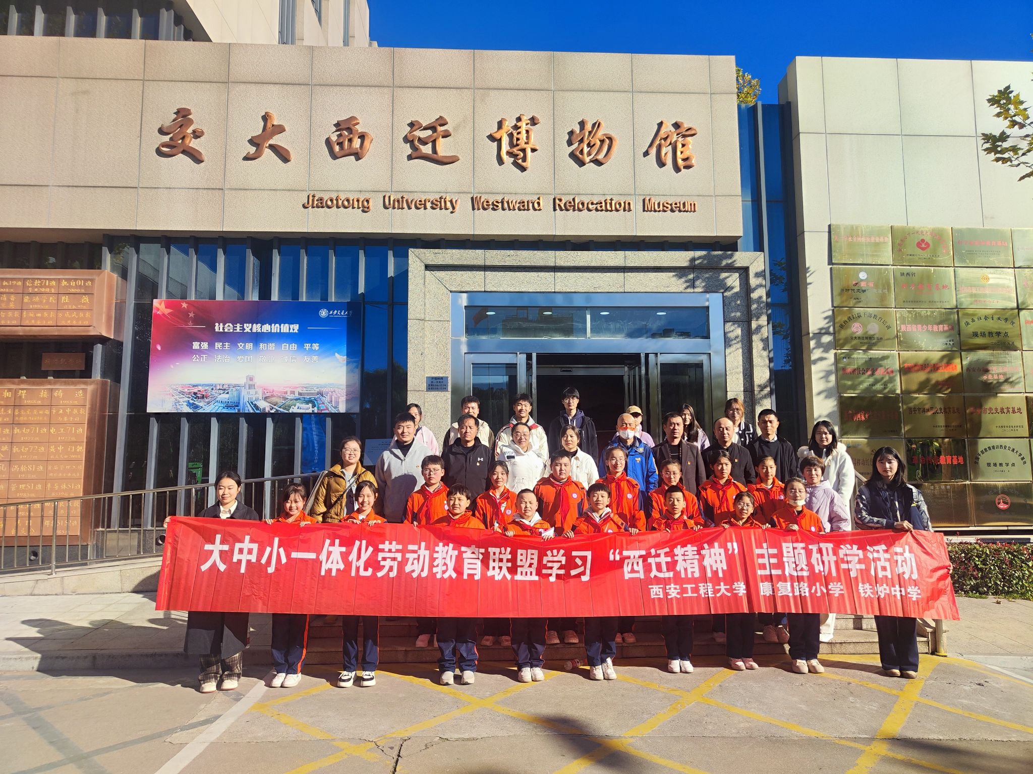 阳光和煦,秋风送爽,11月29日下午,必赢官网协同康复路小学、铁炉中学开展了以学习“西迁精神”为主题的大中小一体化劳动实践教育联盟研学活动。必赢官网学工部带领大学生、“织锦”大学生劳动实践教育工作室成员、铁炉中学、康复路小学师生60余人参加了研学活动。