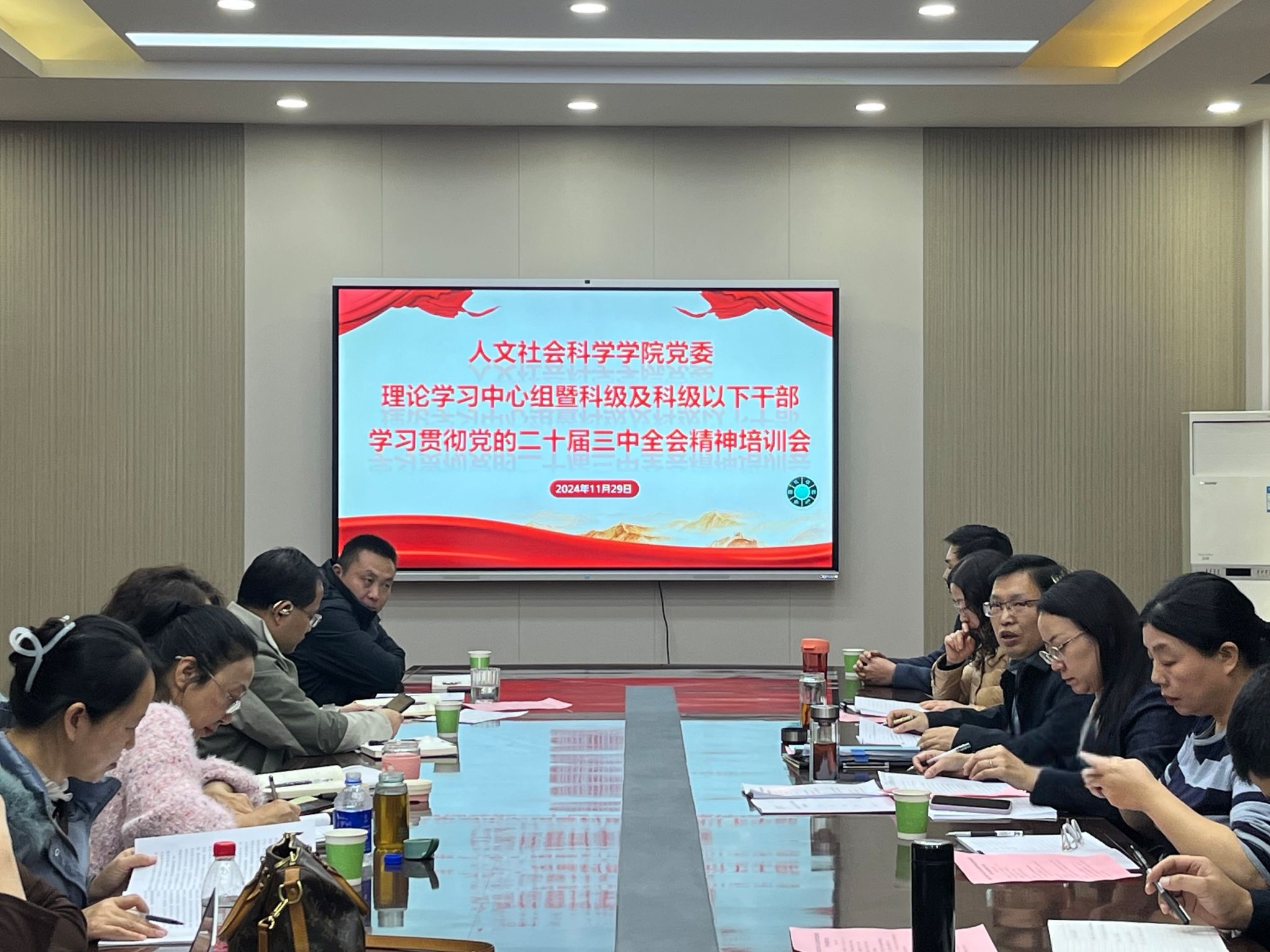 为深入学习贯彻党的二十届三中全会精神,深刻领会全面深化改革的重大意义和实践要求,11月29日上午,人文社会科学学院在人文楼会议室召开党委理论学习中心组集体学习(扩大)会,党委理论学习中心组成员及学院各系部中心主任、各支部书记、全体科级及以下干部参加会议,由院党委书记李喜峰主持。