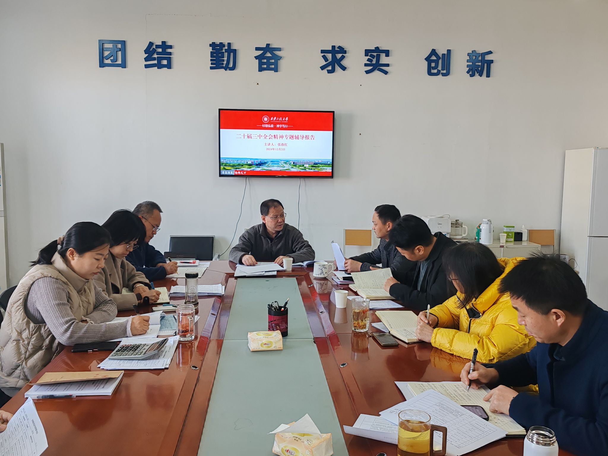 12月3日,副校长张洛红为后勤管理处(集团)党总支作深入学习贯彻党的二十届三中全会精神辅导报告,后勤党政领导班子及各科室(中心)负责人参加,会议由党总支书记杨森主持。