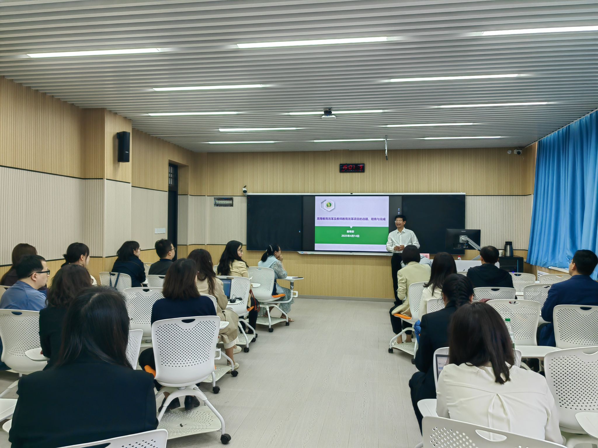 谢寿安教授首先深入剖析了高等教育教学改革和教师教育改革项目的研究趋势,并聚焦2025年陕西省教师教育改革与教师发展研究项目,详细解读了相关情况。接着,谢寿安教授就教改项目“6书”的填报及管理要点进行了深入讲解,帮助教师们更好地掌握从项目申报到成果鉴定全过程中的关键环节。最后,结合高等教育教学改革和教师教育改革项目选题范例,谢寿安教授从研究背景与意义、项目研究内容、项目研究过程、项目研究结果等多个维度,全方位、系统性地分享了申请教改项目的宝贵经验。他的讲解深入浅出、生动形象,参会教师们纷纷表示受益匪浅,对高等教育改革及教师教育改革项目申报有了更深刻的理解和更清晰的思路。
