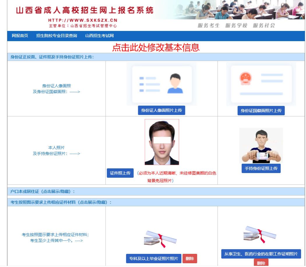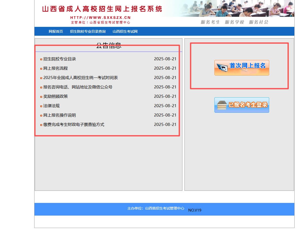 我省成人高考报名采取网上报名、网上信息审核、网上缴费的办法。考生登录“山西招生考试网”(网址:http://www.sxkszx.cn/index.html),请及时关注“山西省招生考试管理中心”公众号关于成考的通知。