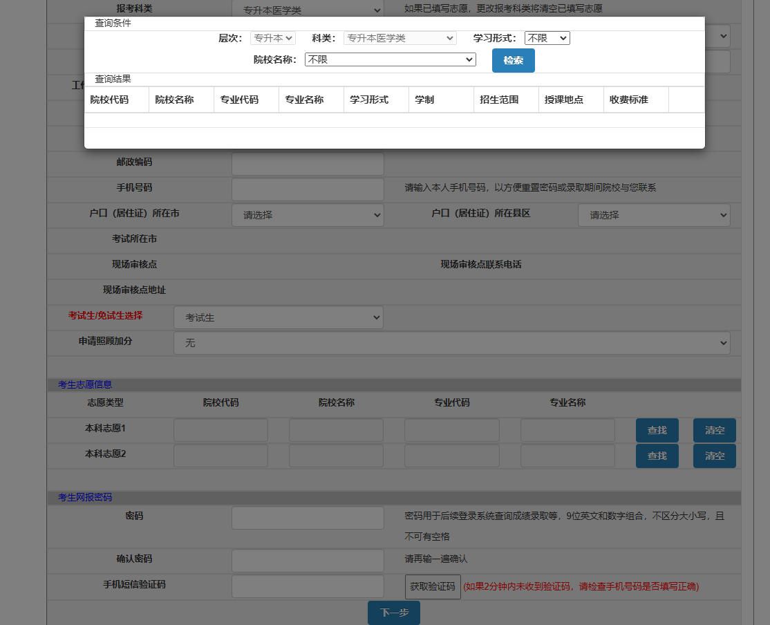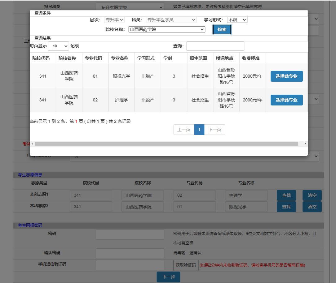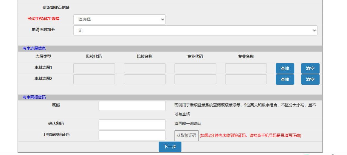 填写正确的考试类型,点查找,选择志愿学校及专业,填写并牢记密码。