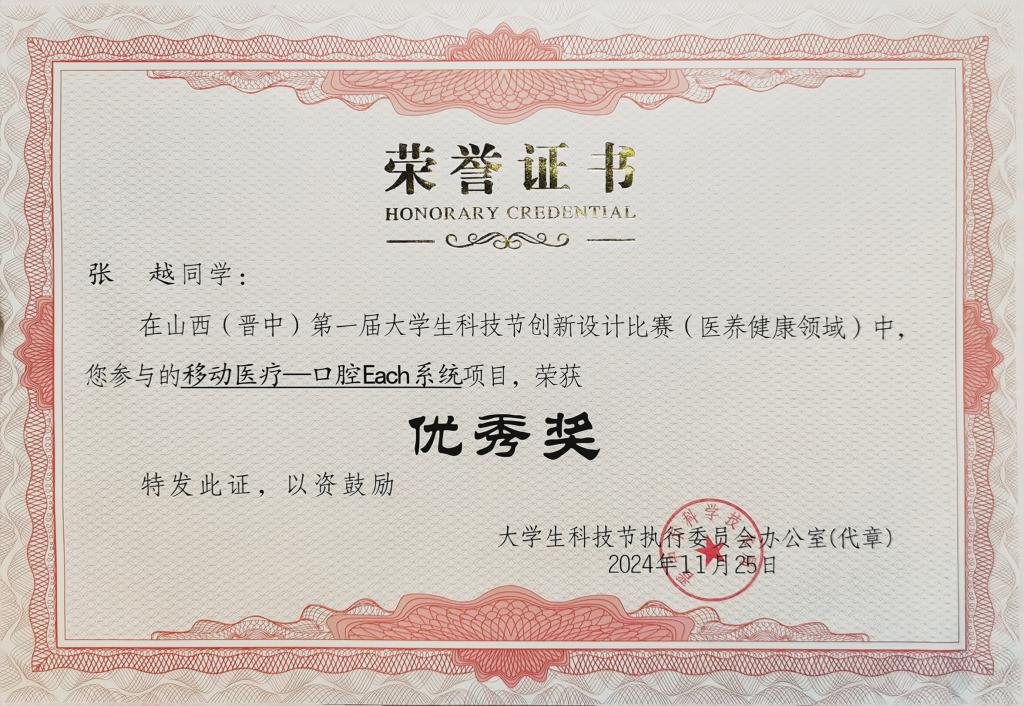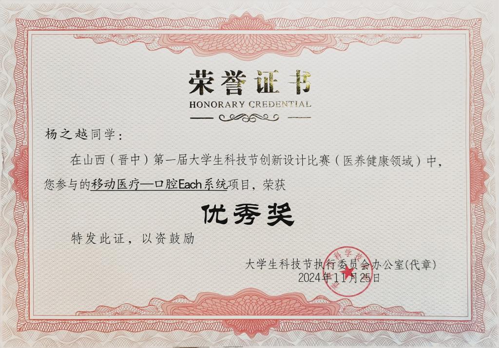 11月6日,由山西省科学技术厅、山西省教育厅指导,中共晋中市委、晋中市人民政府共同主办的“山西省科技活动周·山西(晋中)第一届大学生科技节创新设计比赛”在山西工程职业科技大学举行。临床医学系口腔医学教研室教师蔡岫颖、鞠华龙指导的口腔医学专业921班胡杨、922班杨之越和922班张越三位同学,凭借项目“移动医疗-口腔Each系统”的出色表现,荣获比赛优秀奖。
