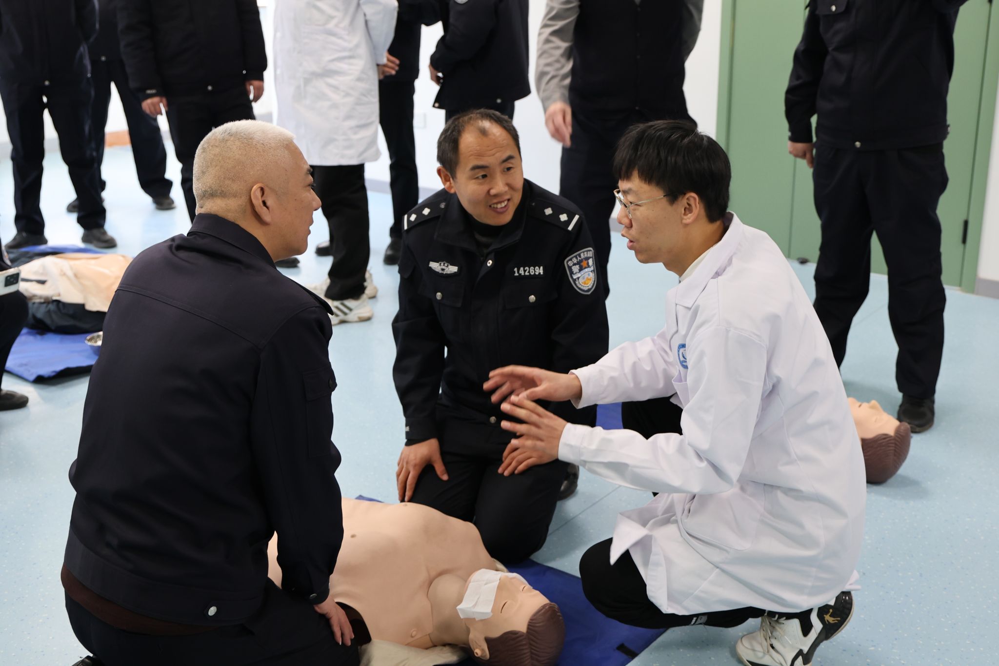 为持续推动“我为群众办实事”走深走实,进一步增强基层一线工作人员的应急救护能力,11月18日至19日,临床医学系在保卫处的协调支持下,在我校OSCE中心为汾阳市太和桥派出所全体干警、义警开展急救技能专题培训。太和桥派出所所长郑俊杰、指导员杨剑峰,临床医学系党总支书记贾爱萍、系主任韩文萍,保卫处处长梁勇刚,临床医学系党总支副书记郭晋,保卫处治安科负责人韩志远等出席活动。