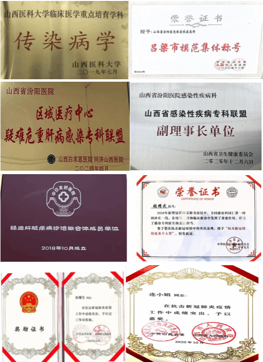 山西省汾阳医院感染性疾病科成立于1982年,原址位于汾阳医院U形美式住院楼东一层,2005年12月迁入传染病区。经过30余年的发展、壮大,目前已成为集医疗、教学、科研、预防四位一体的市级重点建设科室,我科为山西医科大学传染病学临床医学重点培育学科,山西省结核病专科联盟副理事长单位,山西省感染性疾病专科联盟副理事长单位,山西省门静脉高压联盟副理事长单位,北京地坛医院协作医院的科室,吕梁市医学会感染病学专业委员会、吕梁市医学会肝病专业委员会、吕梁市医疗质量控制中心传染病质控部挂靠我科,担负着我市及周边各省地传染病的突发公共卫生事件的救治工作,收治了大量疑难危重传染病患者,2020年新冠疫情爆发以来,我院作为吕梁市新冠肺炎定点救治医院,共收治了1000余名新型冠状病毒感染患者,受到省市上级部门多次记功及奖励等表彰。