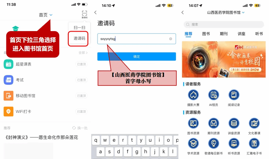 点击学习通首页右上方邀请码,输入邀请码“sxyyxytsg”(beat365官方网站图书馆首字母小写)进入图书馆首页,了解更多图书馆定制服务。