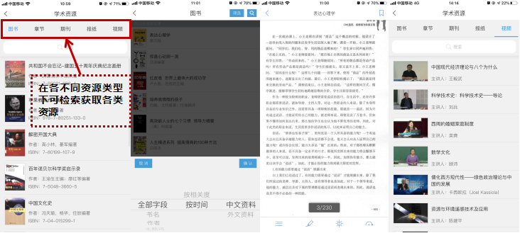 1.移动图书馆:为读者提供了百万种中文电子图书,百余种报纸,视频、音频资源两千余系列;读者直接点击“图书”“期刊”“报纸”等即时阅读,可进入“学术资源”检索并获取自己所需要的资源。