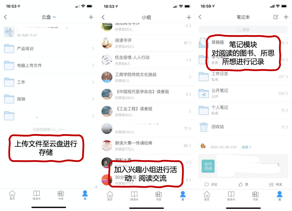 3.“我”的模块:集中管理读者相关信息。您可看到自己收藏的资源、创作的专题、云盘内的资料、加入的小组以及笔记等。