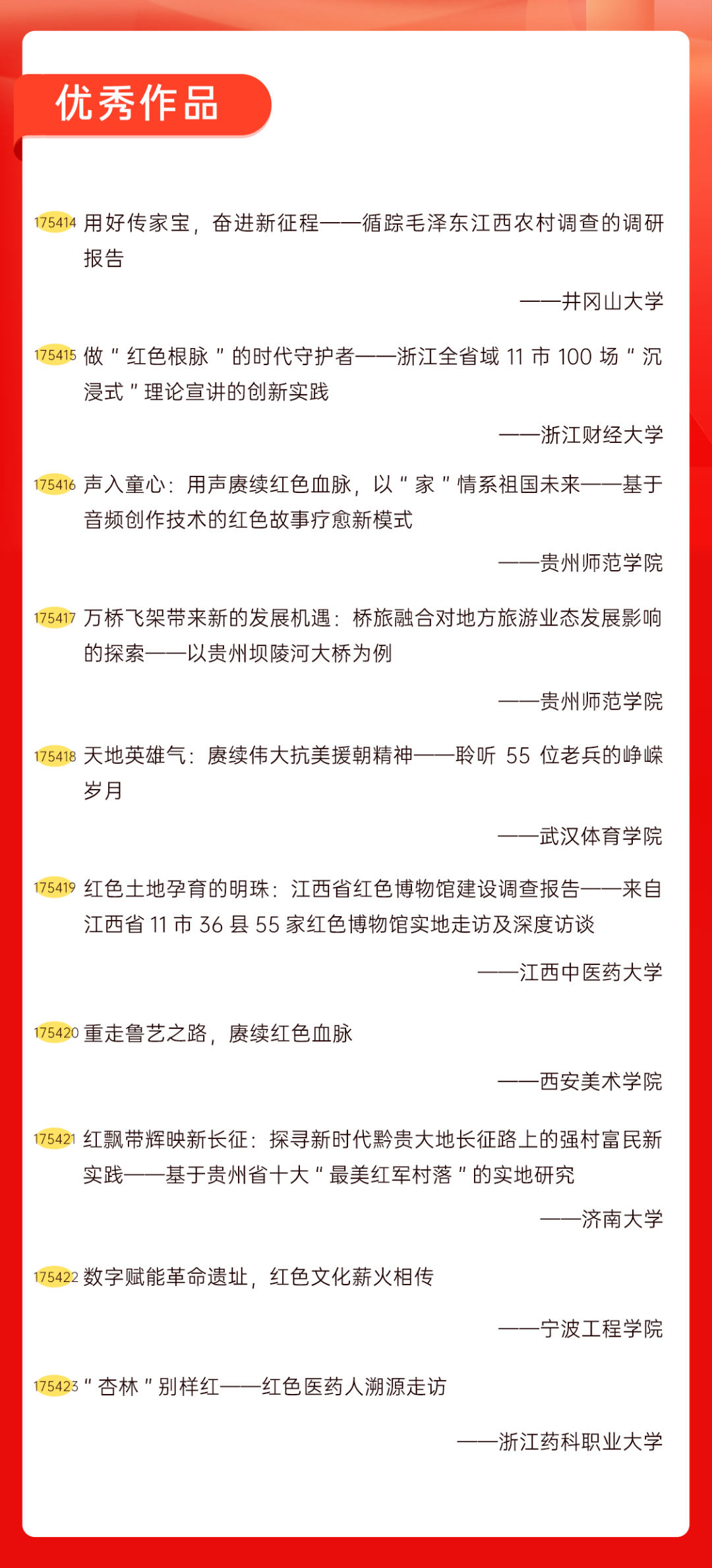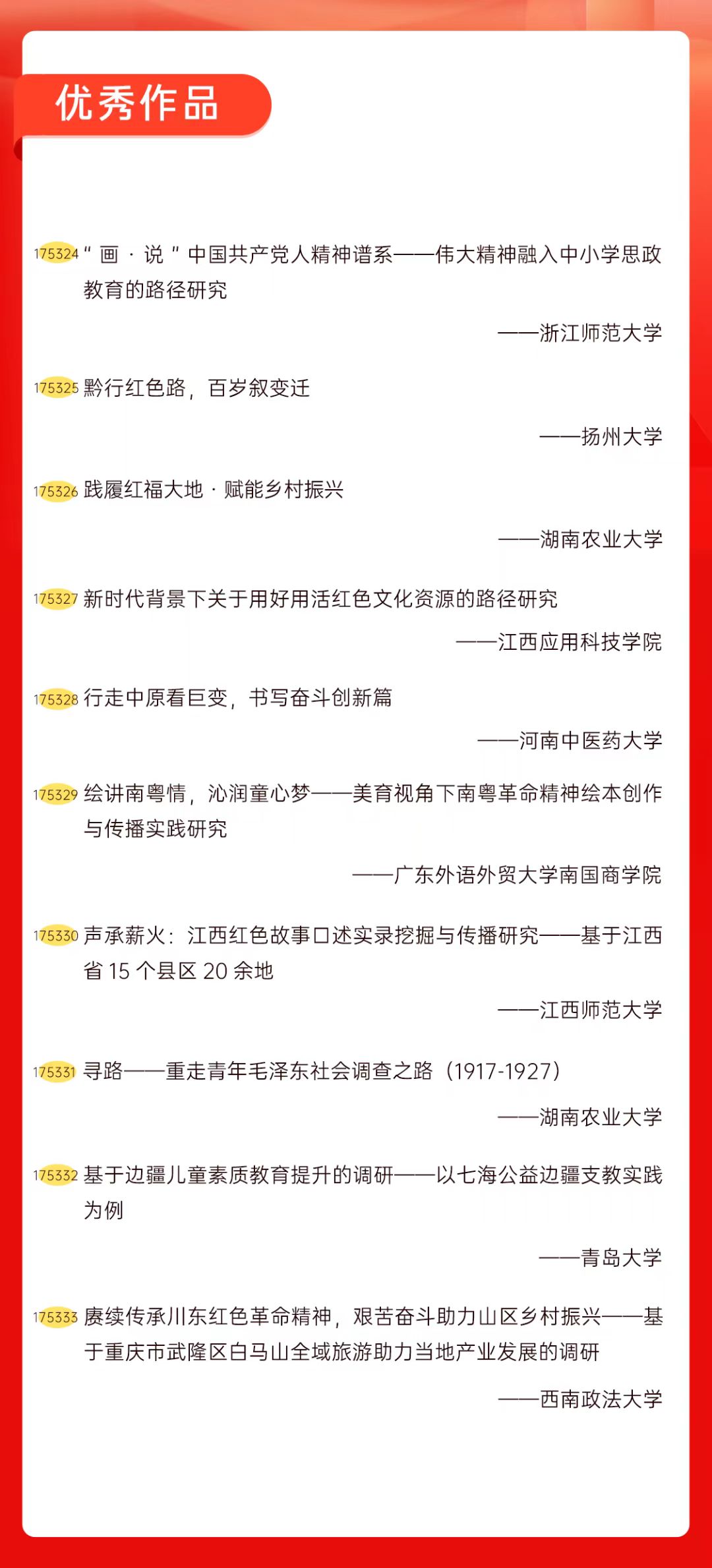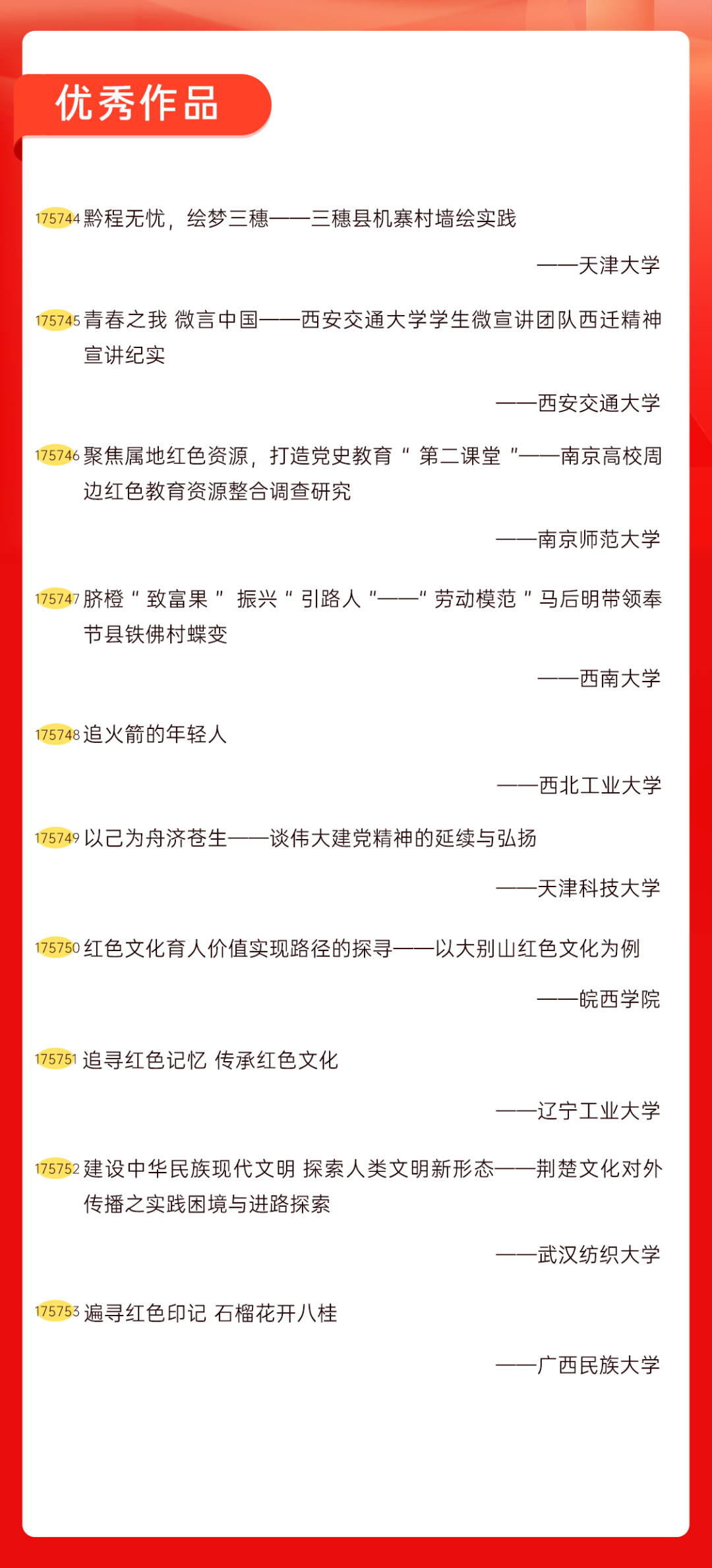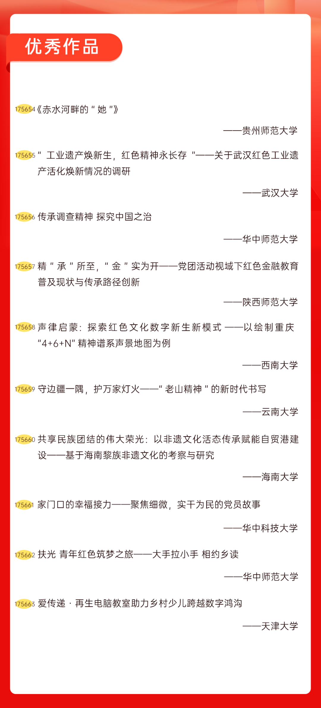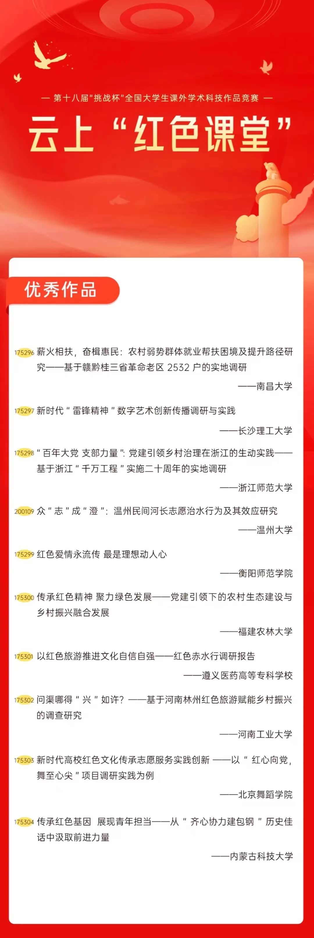 为增加广大青年互动式学习和交流,让青年学生的实践成果形成更广泛的社会影响,辐射带动更多青年学生突破空间限制、感受朋辈风采、传承红色基因,组委会将部分优秀作品建成红色教育的云上“红色课堂”。