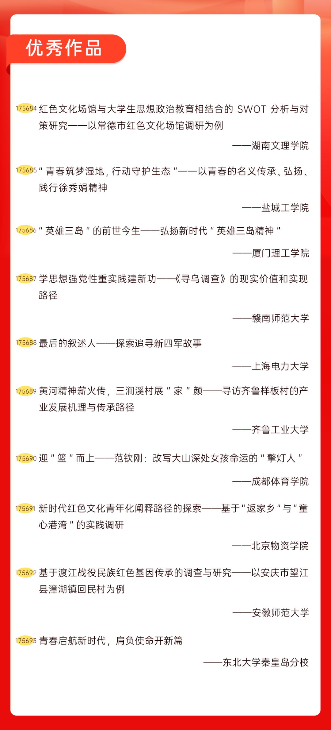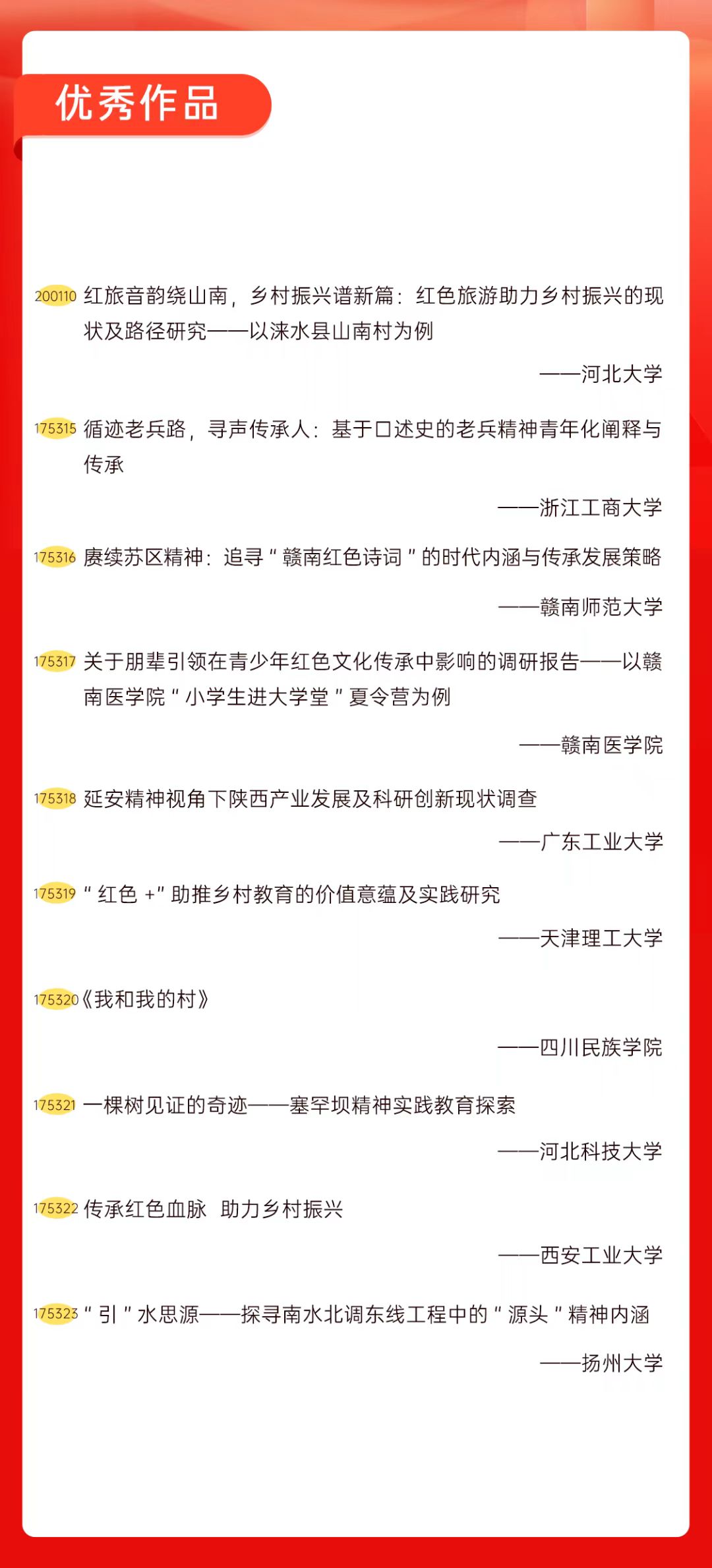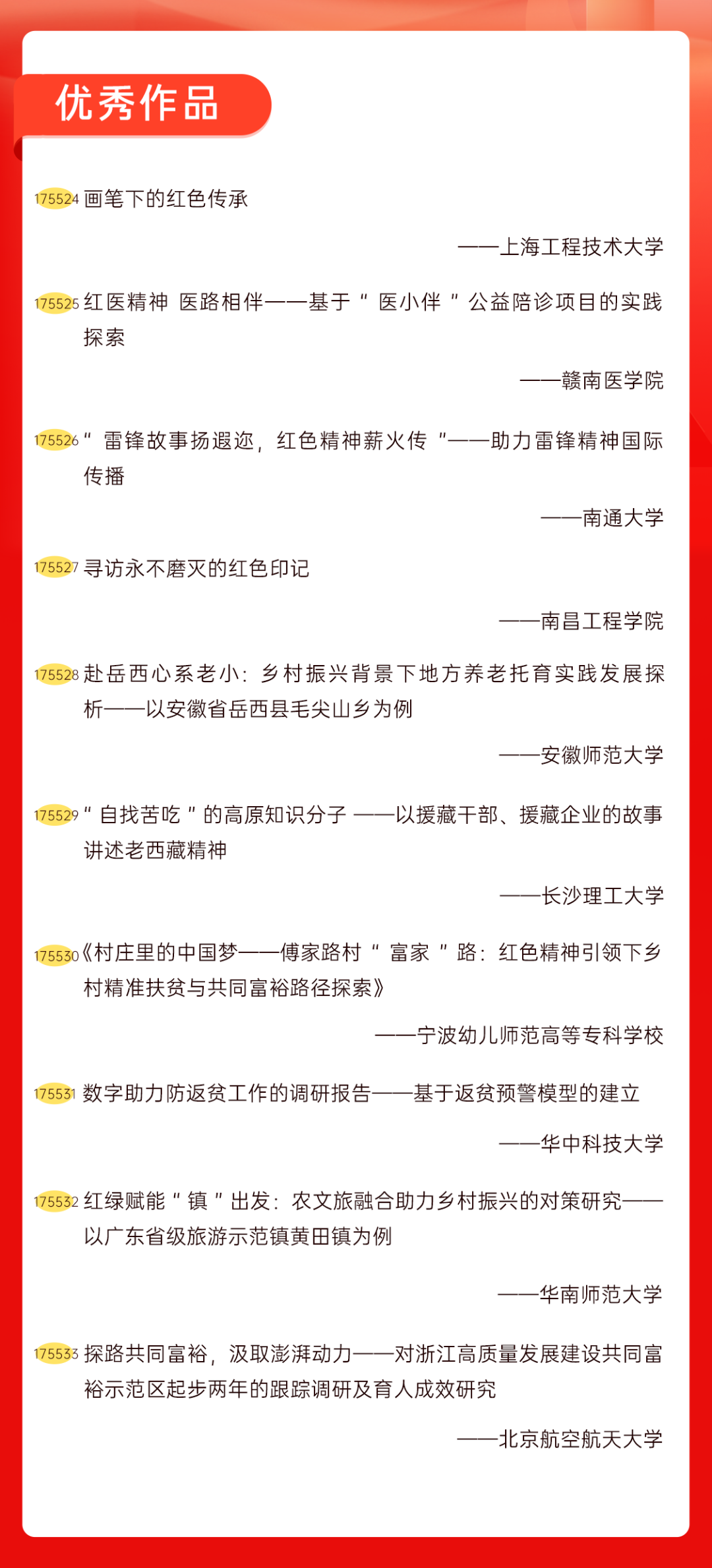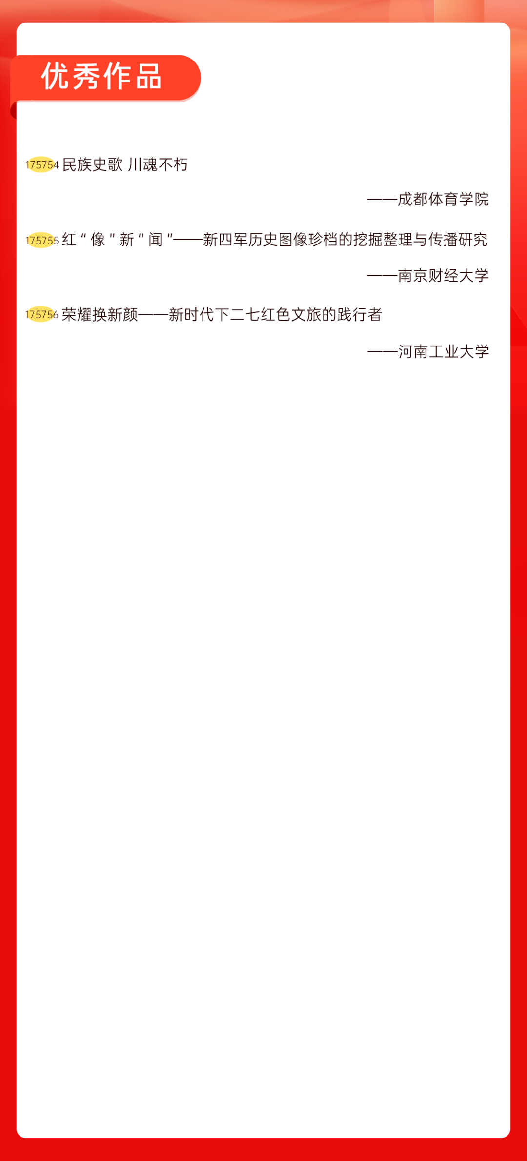 为增加广大青年互动式学习和交流,让青年学生的实践成果形成更广泛的社会影响,辐射带动更多青年学生突破空间限制、感受朋辈风采、传承红色基因,组委会将部分优秀作品建成红色教育的云上“红色课堂”。