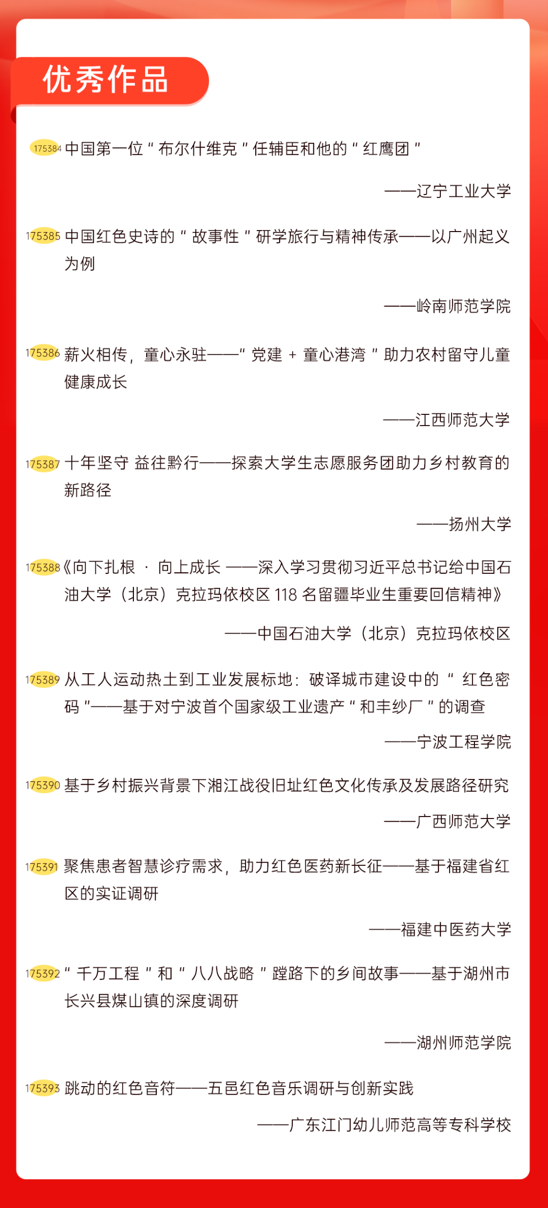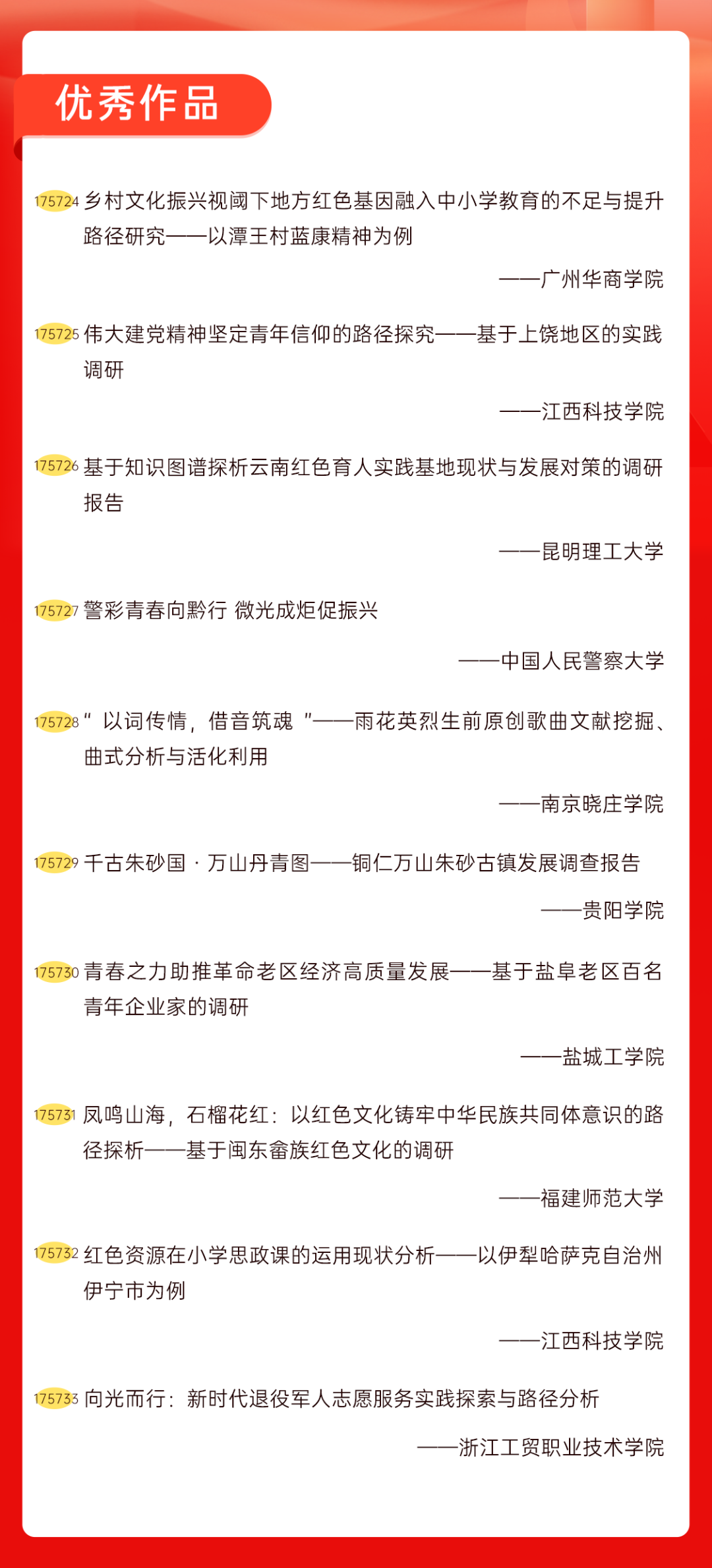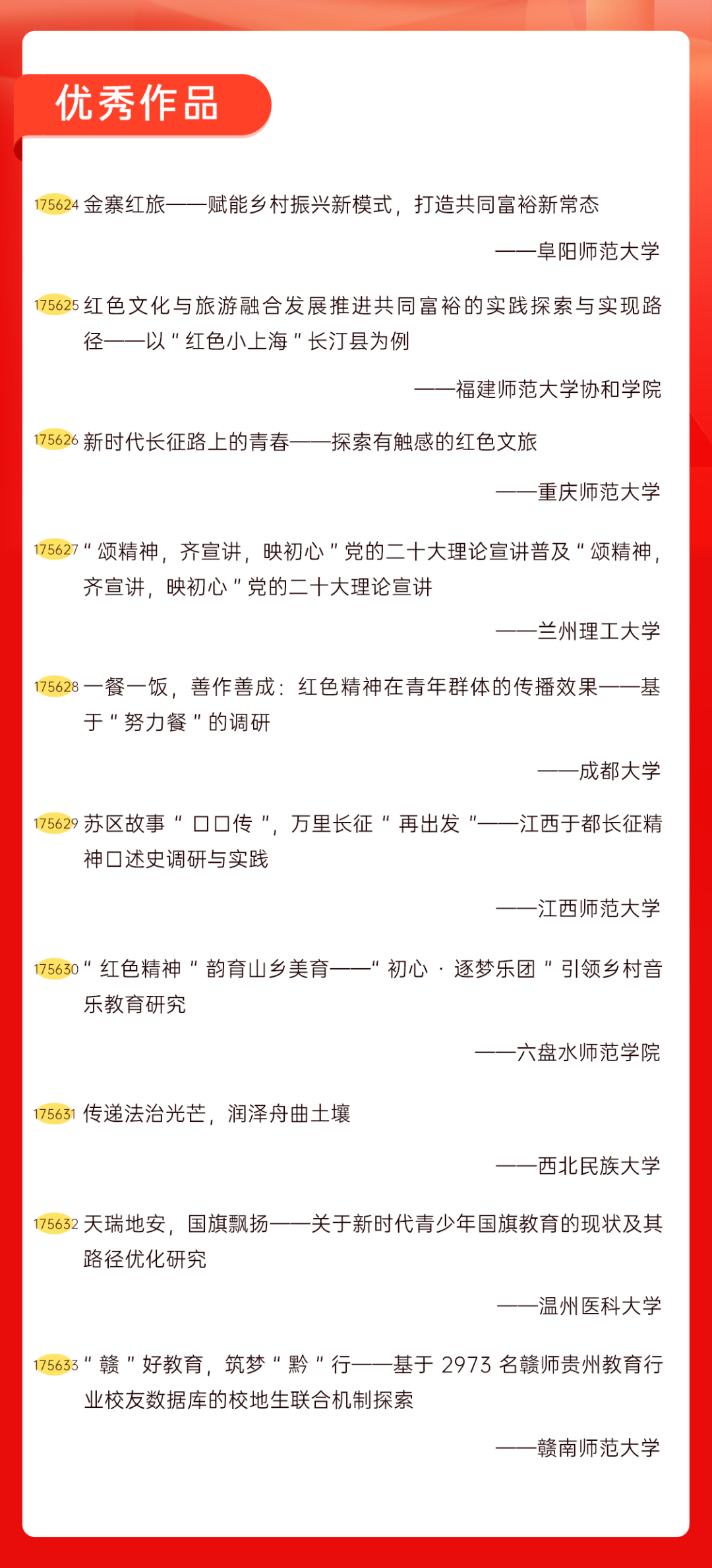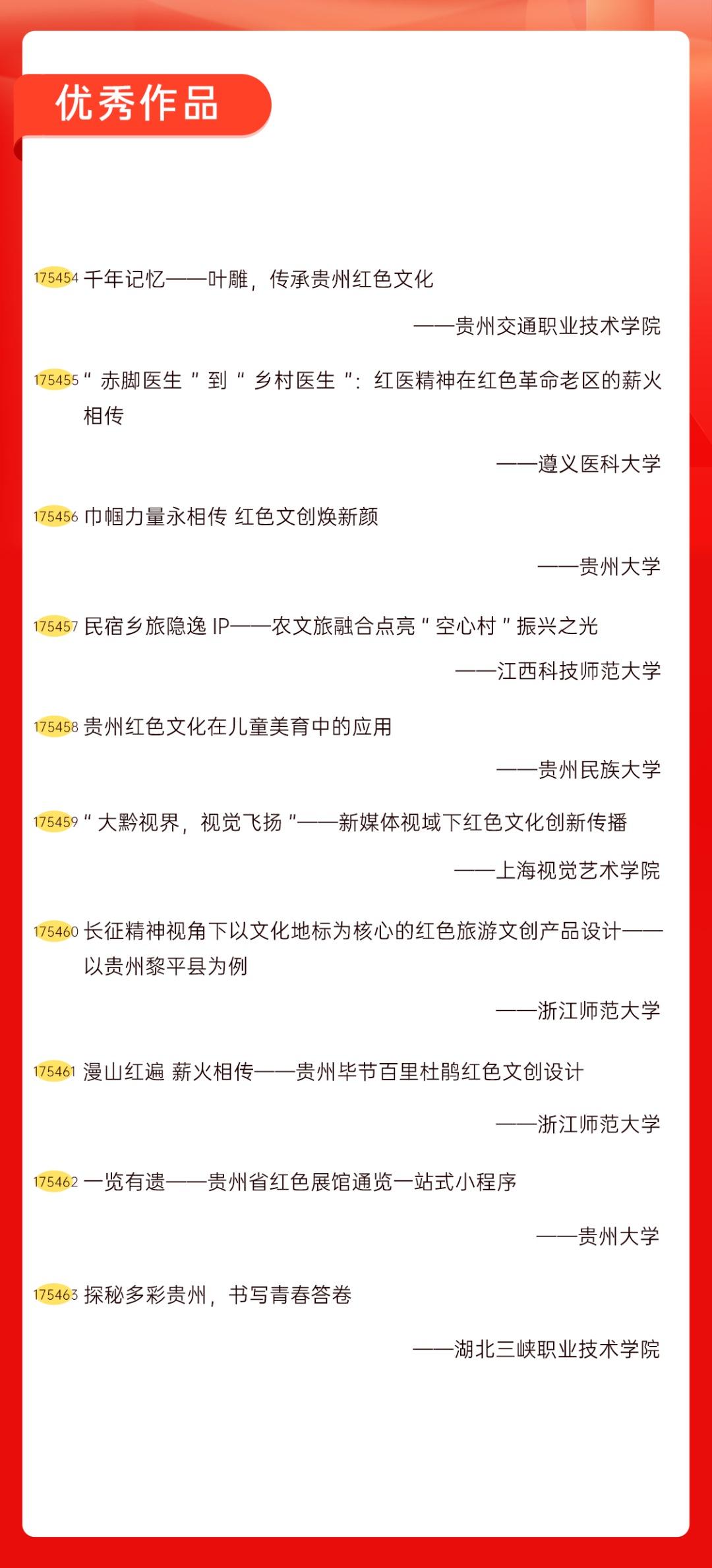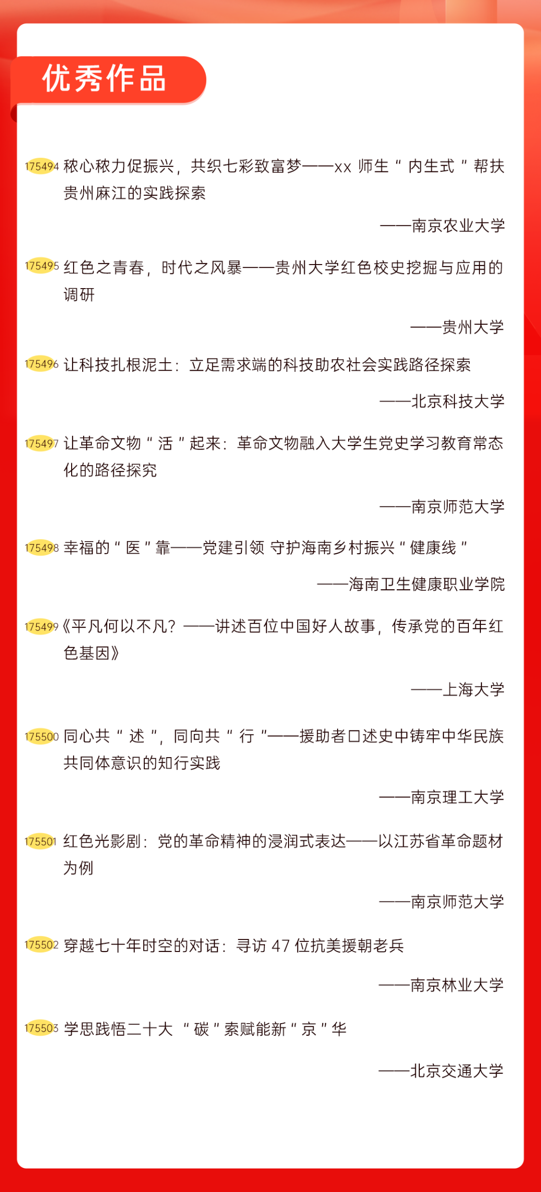 为增加广大青年互动式学习和交流,让青年学生的实践成果形成更广泛的社会影响,辐射带动更多青年学生突破空间限制、感受朋辈风采、传承红色基因,组委会将部分优秀作品建成红色教育的云上“红色课堂”。
