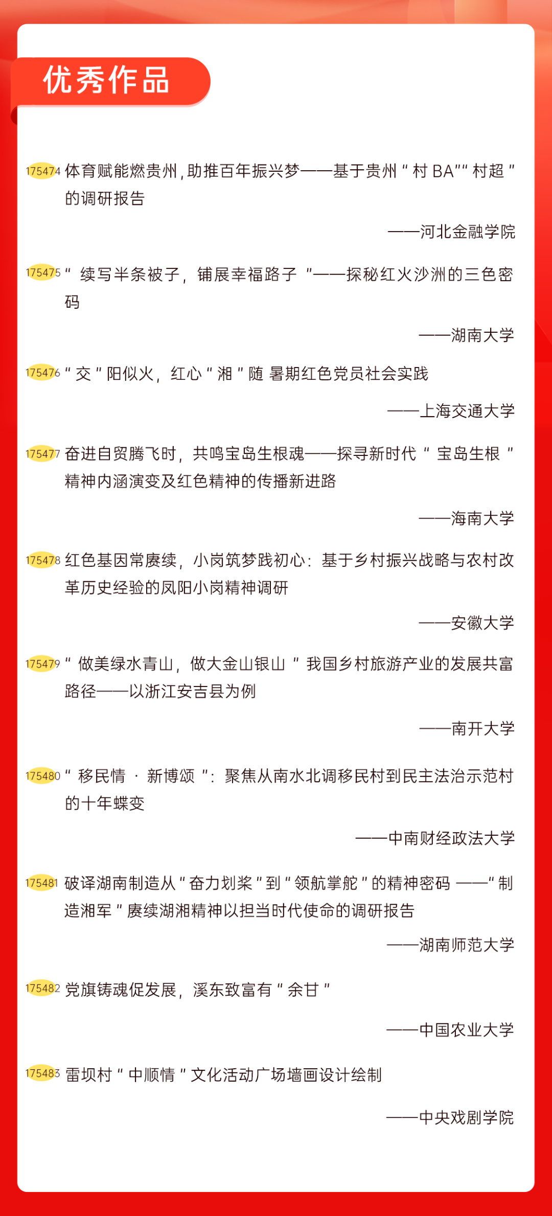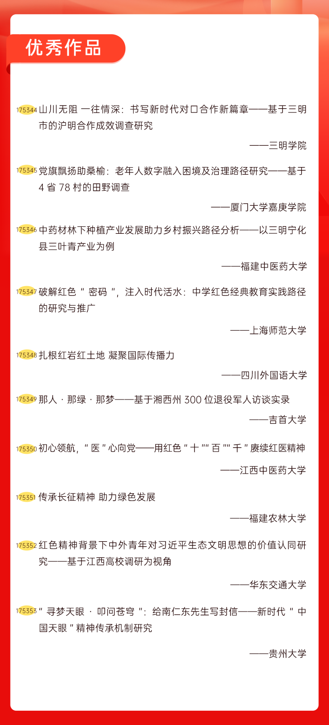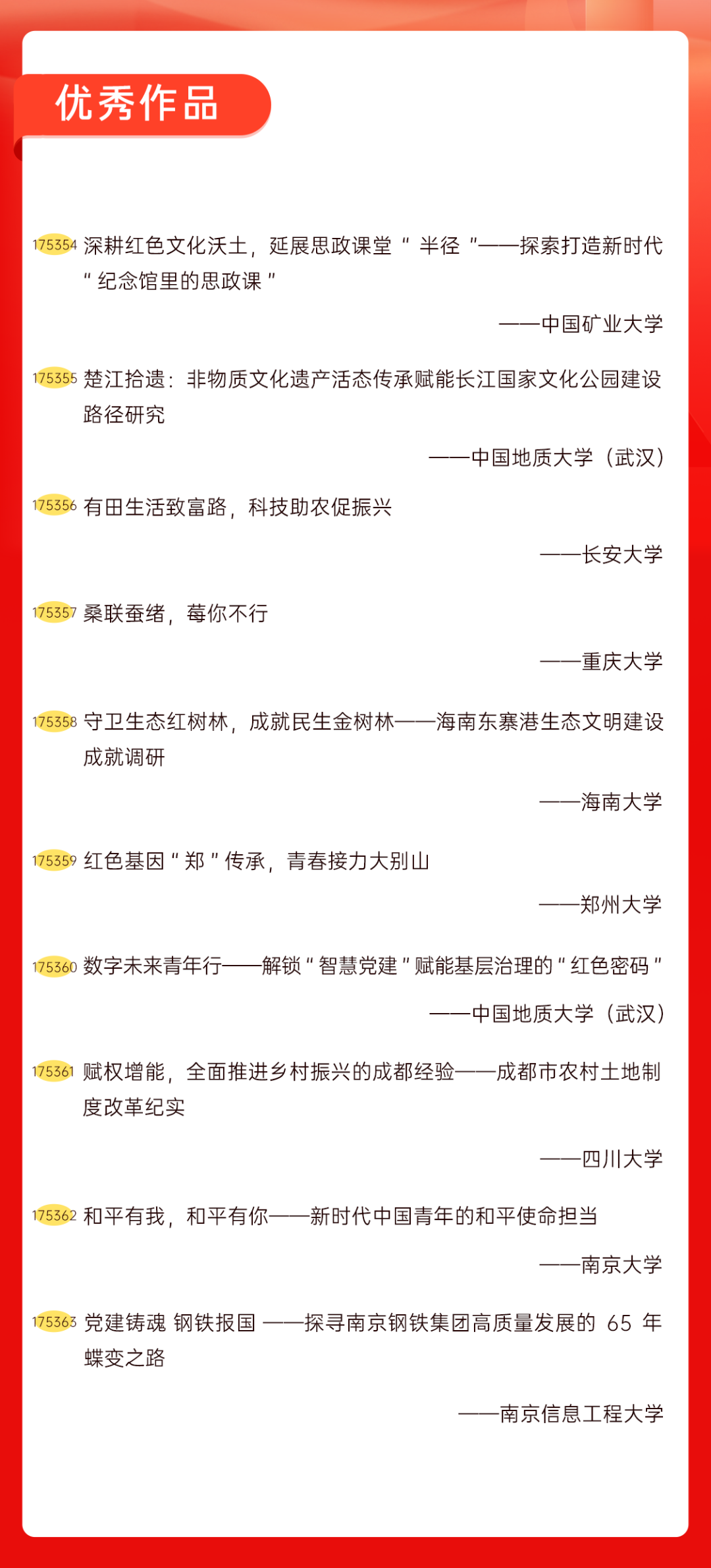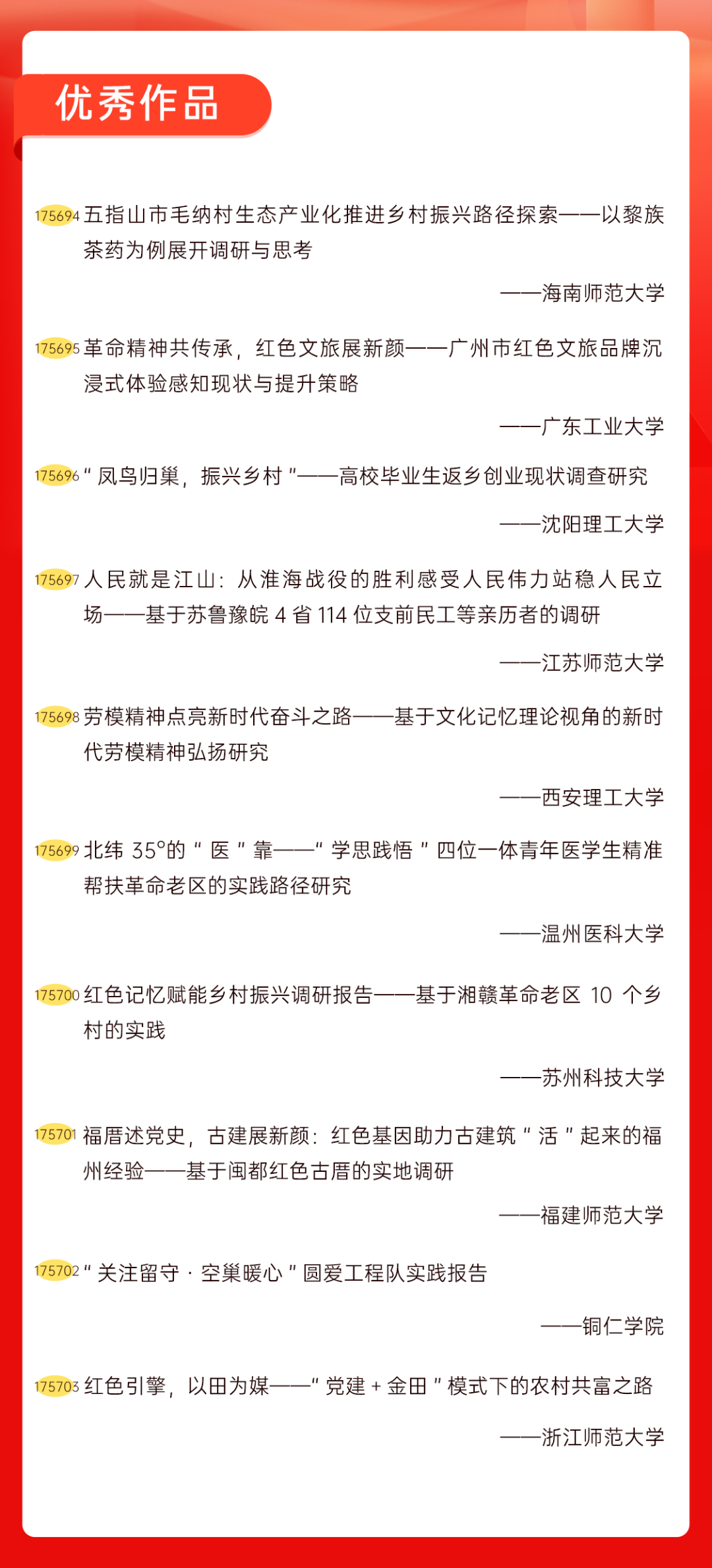 为增加广大青年互动式学习和交流,让青年学生的实践成果形成更广泛的社会影响,辐射带动更多青年学生突破空间限制、感受朋辈风采、传承红色基因,组委会将部分优秀作品建成红色教育的云上“红色课堂”。
