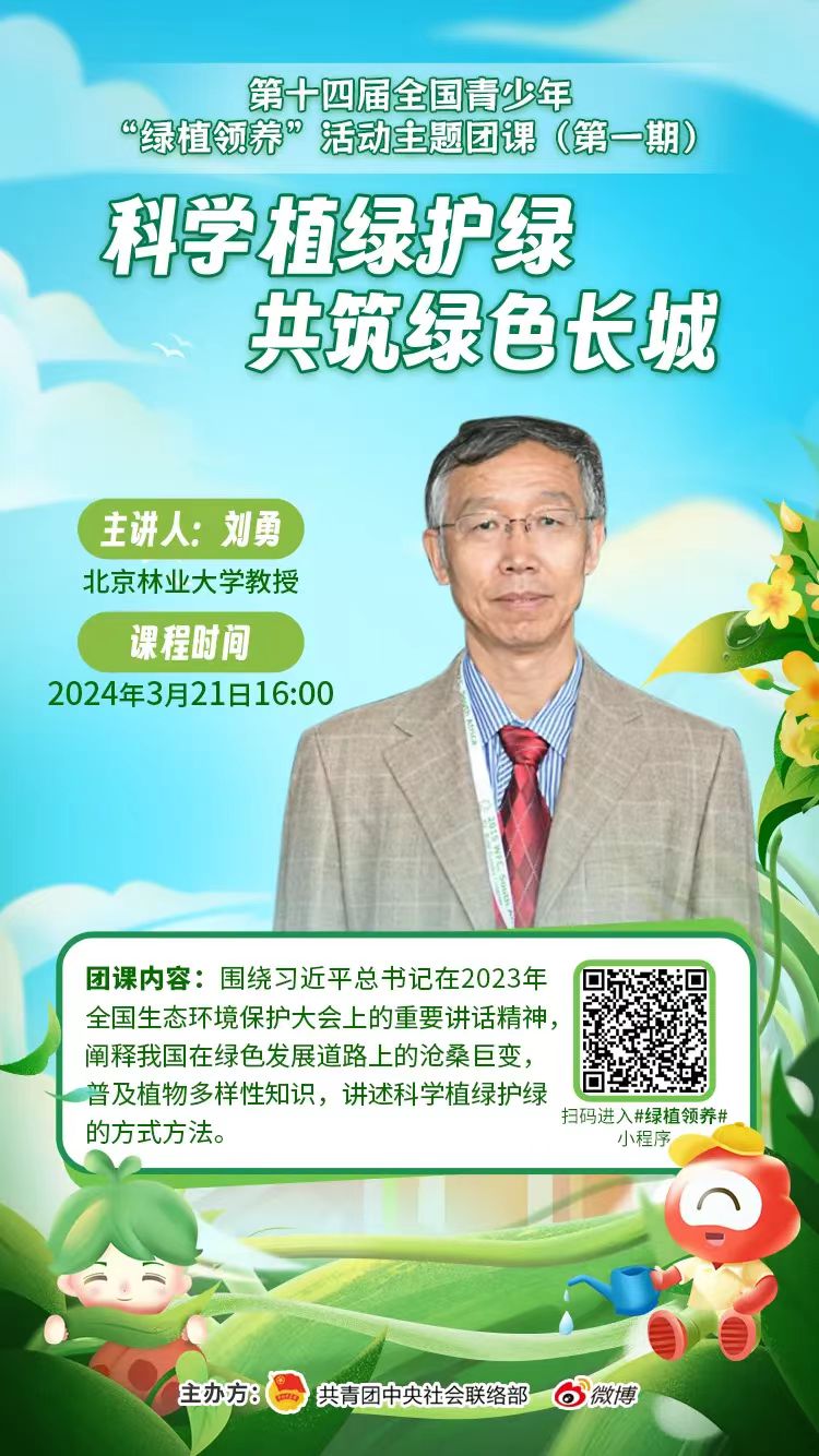 本期团课中,我们将跟随刘勇教授的讲述,了解森林中的植物多样性,领略我国在治沙植树方面取得的绿色奇迹,学习如何科学地植绿护绿,为构建人与自然和谐共生的美丽家园贡献青春力量。