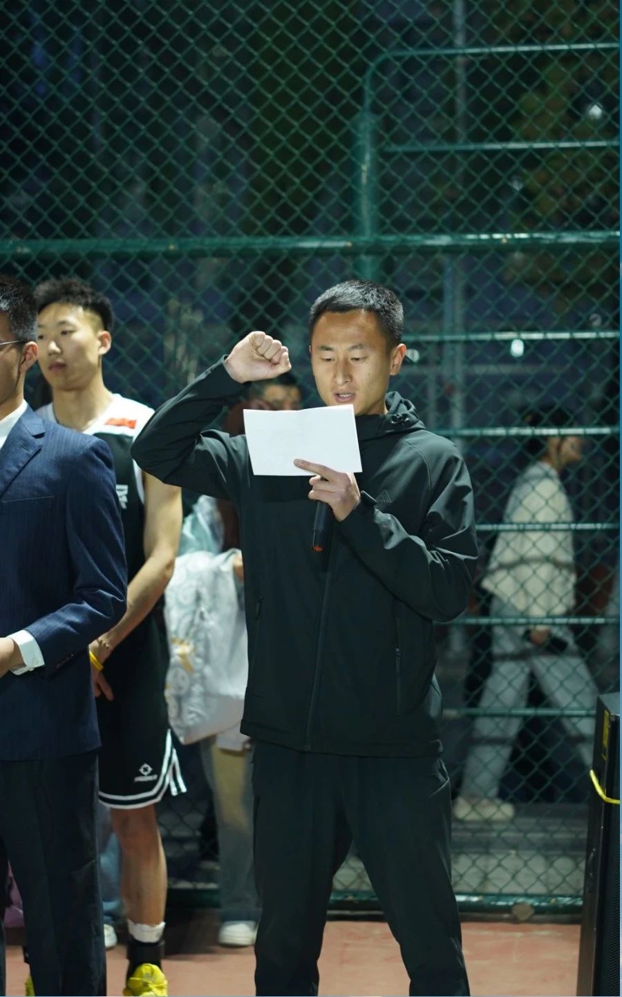 在雄壮的国歌声中,本年度篮球赛拉开帷幕。体育运动委员会副主任、基础医学部主任乔海兵致开幕词,裁判员代表黄登峰老师和运动员代表82005班武文杰分别宣誓。基础医学部党总支书记姚万军宣布比赛开幕。学生处处长常明亮为比赛开球。