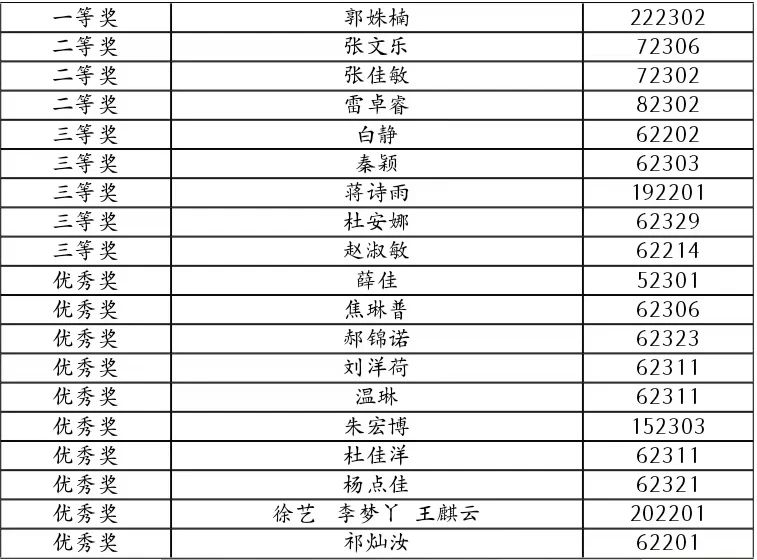 三等奖 192201 蒋诗雨 62202 白静 62214 赵淑敏 62329 杜安娜