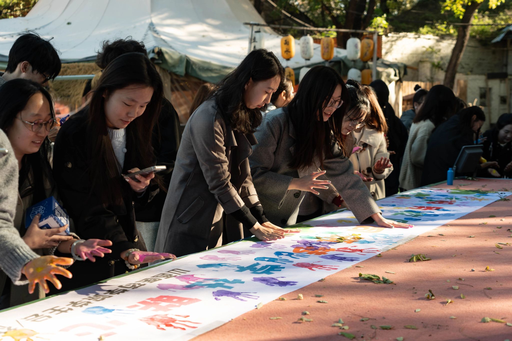 活动伊始,成员们陆续签到入场,每人都收获了一份精心准备的盲盒,拆开瞬间的惊喜笑容拉开了团建的序幕。随后的“手印签到墙”环节,大家蘸取五彩颜料,在主题背景板上按下专属手印,一个个鲜活的印记交织成独一无二的团队画卷,既象征着每位成员的不可或缺,更定格了“医路相伴”的初心,让“服务校园同筑梦,学社联心谱新篇”不仅仅是口号。