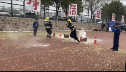 30米赛道运送灭火器灭火项目中,身着全套战斗服的学子全力狂奔,精准判断火势、熟练操作灭火器。