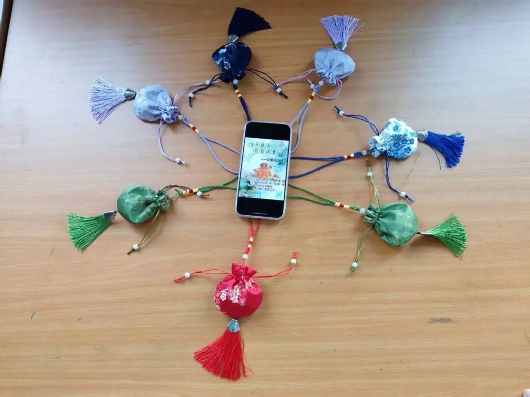 香囊DIY环节,现场草木清香萦绕,同学们围聚在香料旁自主搭配香方,或混搭陈皮与薄荷,或甄选沉香与丁香,将个人喜好融入香材搭配中,打造专属自己的独特香方。随后,大家用素雅布料缝制香囊,部分作品缀以精致流苏、绣有古典纹样,每一枚香囊都兼具质感与清香,承载着同学们的心意与热忱,成为可触摸、可细品的手作好物。