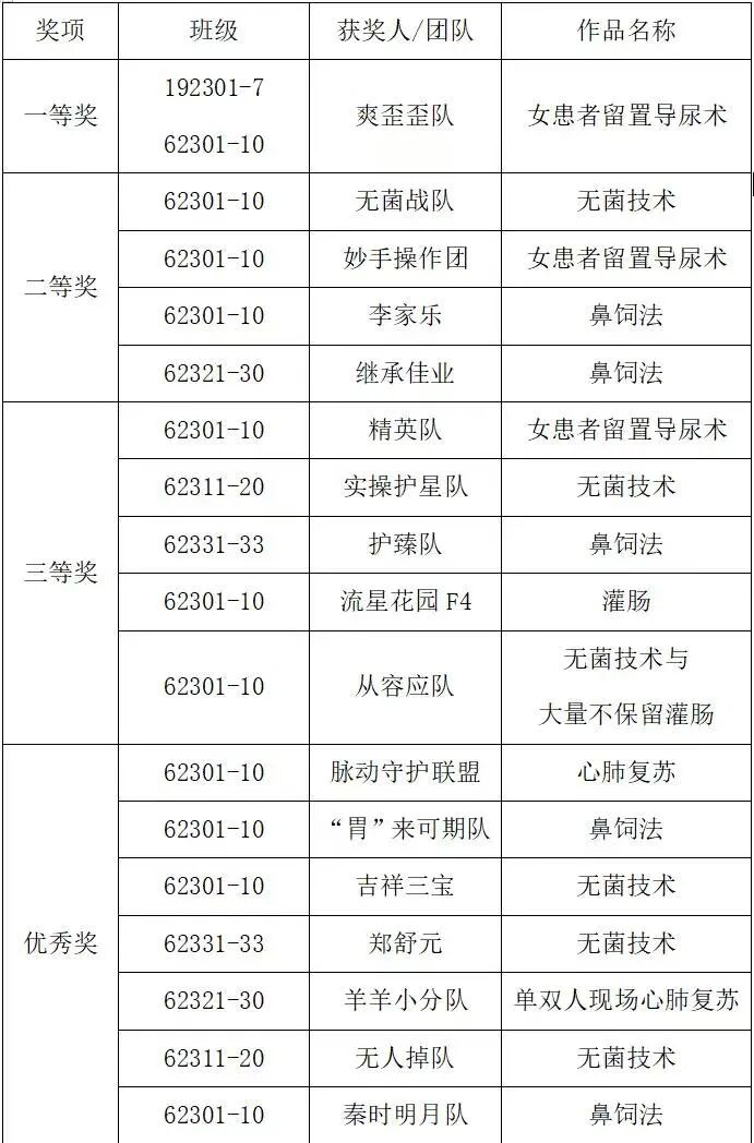经过评审团的“双盲评审”与多维度打分,最终评选出一等奖1名、二等奖4名、三等奖5名、优秀奖7名。其中,“爽歪歪队”的《女患者留置导尿术》凭借精准规范的操作流程斩获一等奖,“妙手操作团”“继承佳业”等团队的作品也因兼具教学价值与创新表现力脱颖而出。获奖作品涵盖了临床护理多项核心技能,不仅成为检验学子专业功底的“试金石”,更构建起可复用的实训教学案例库,为低年级同学提供了生动直观的学习范本。
