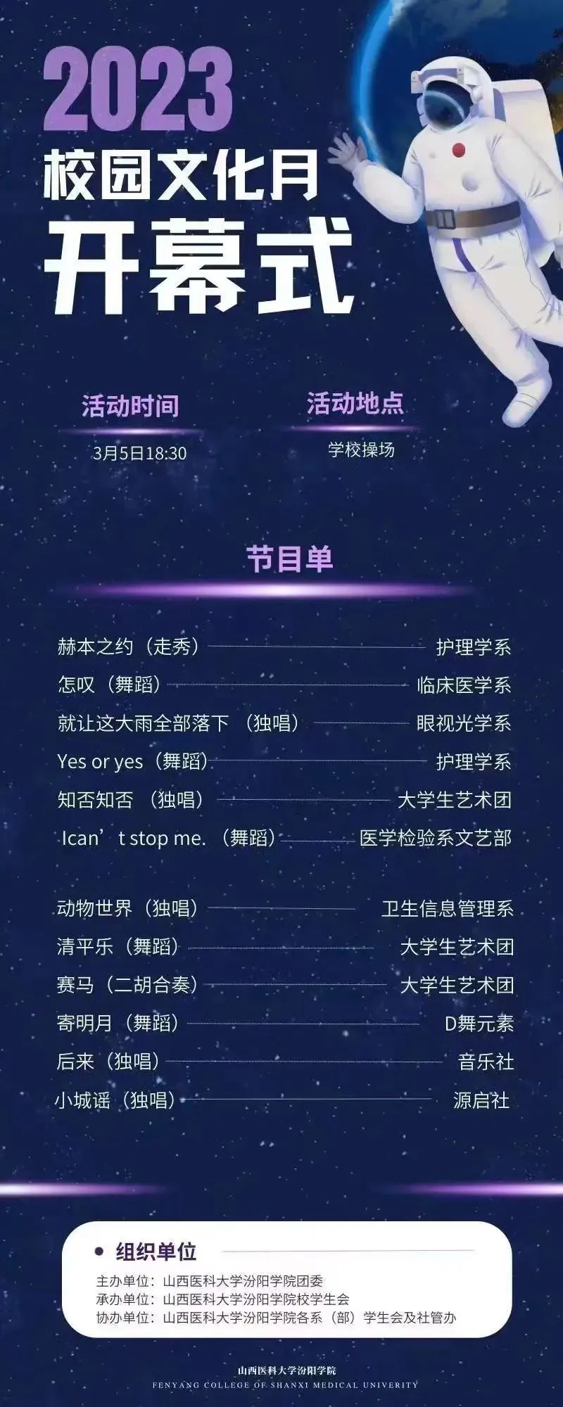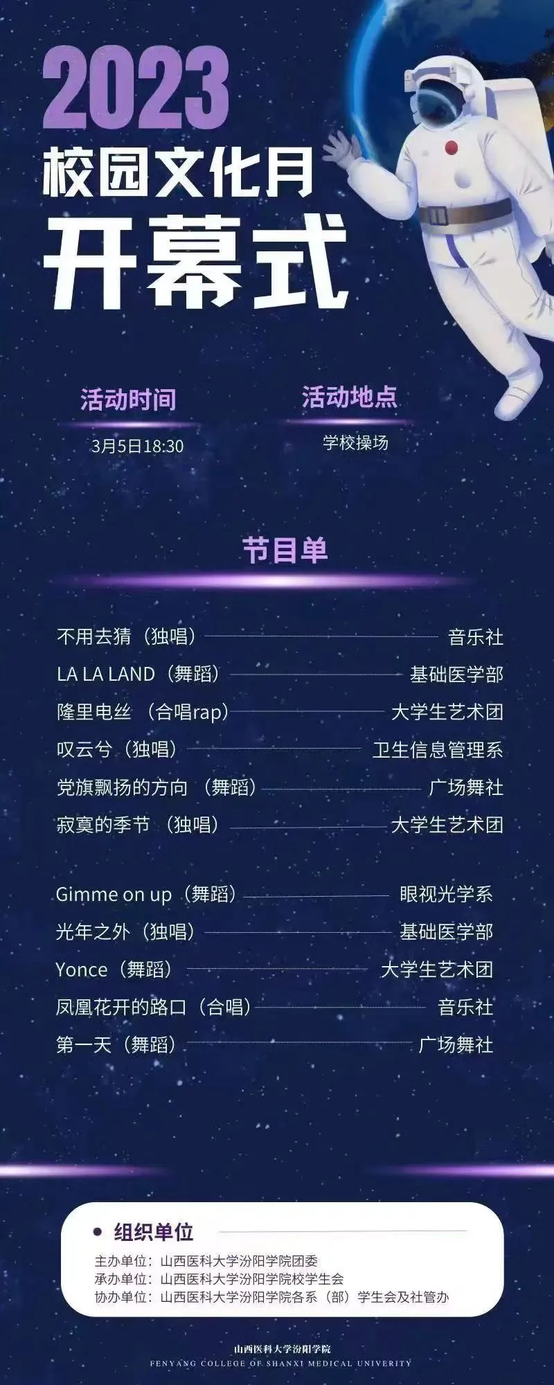 校园文化月预热活动将于3月5日15时在校体育场举行,届时我们将会看到各社团、各系部同学展现当代大学生独有的青春活力!相信屏幕前的你已经开始有所期待!心动不如行动!3月5日我们在操场等你!