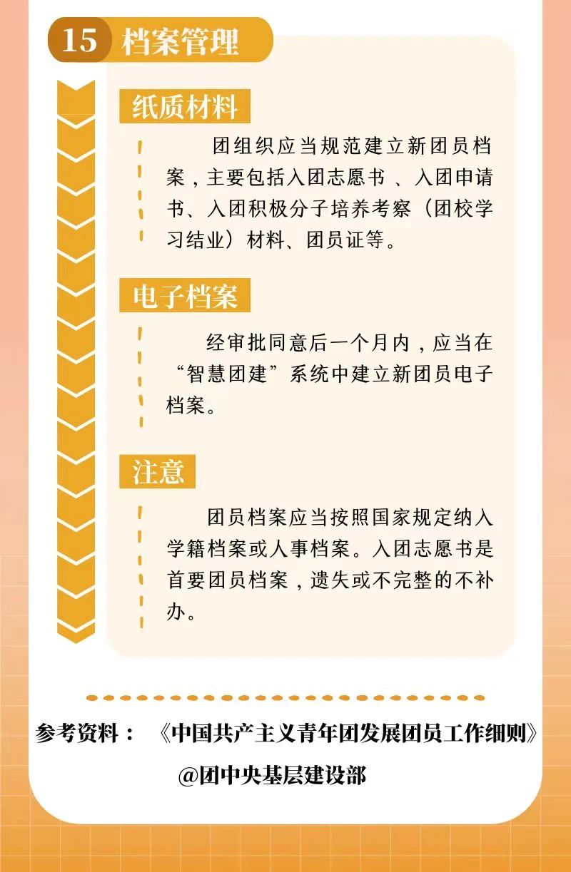 2023年8月,共青团中央修订《中国共产主义青年团发展团员工作细则》,明确从“申请入团、入团积极分子的确定、教育培养和考察、发展对象的确定、新团员的接收”5个阶段15个步骤的入团流程,进一步规范发展团员工作。