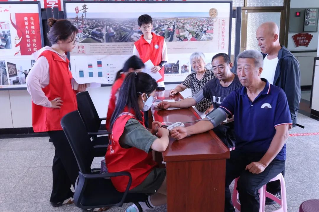 7月16日早晨,队员们在村委会大厅设立了免费的血压检测点,调研了解村民的身体健康状况,并为他们提供了日常预防与保健的建议。通过亲切细致的交流,了解辛村当地的健康卫生条件和当地居民的健康意识,队员们感受到了村民对完善便捷的医疗服务的迫切需求。宣讲组的几位同学利用村内广播进行了脱贫攻坚、乡村振兴、健康知识等方面的宣讲,同时进行了山西医科大学汾阳学院的招生宣传,村民纷纷表示受益颇丰。