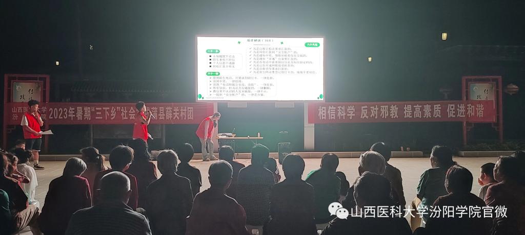 7月8日,在薛关村广场,同学们用家乡方言为村民们讲解了国家政策法规、健康知识、反邪教、农业生产、用水用电安全等内容,放映了反邪教微电影《伤逝》,开展了免费测量血压、血糖等健康检测活动,分三组进入村民家中深入了解民情,调研他们的基本生活情况,同时完成了防诈骗以及部分常用医学常识的宣传。实践队师生参观了蒲县现代农业展示园和果蔬大棚采摘园,学习了蔬菜、水果以及一些花卉的生长原理;参观了蒲县地标性建筑——蒲子文化宫,亲身感受到了农业生产和人民生活的新发展、新变化、新气象。