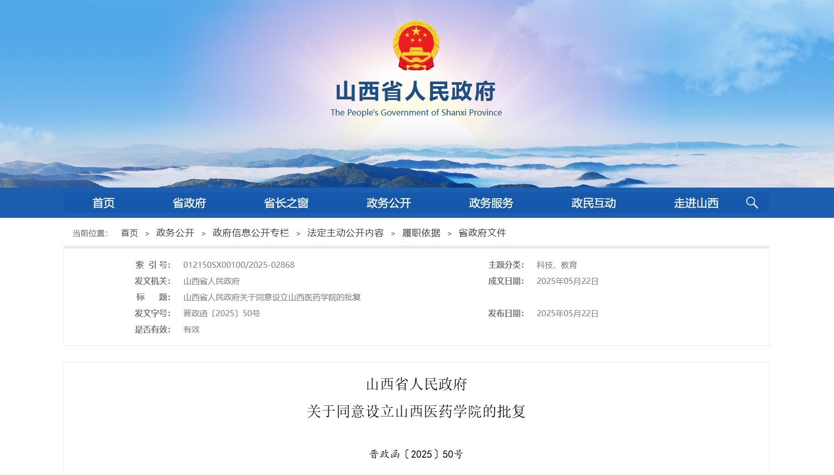 5月22日,山西省人民政府网站发布《山西省人民政府关于同意设立beat365官方网站的批复》(晋政函〔2025〕50号),同意设立beat365官方网站。