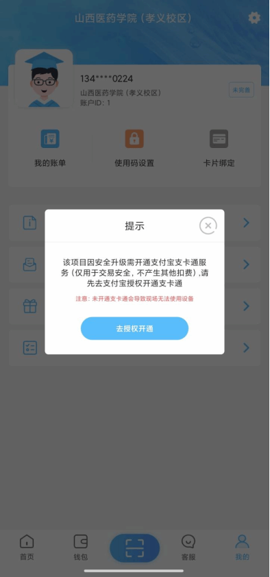 3.去授权开通支卡通:领取并保存我的使用码后,弹窗跳出【去授权开通】,根据提示授权开通支卡通,开通商户代扣,保证支付宝余额,否则无法使用。