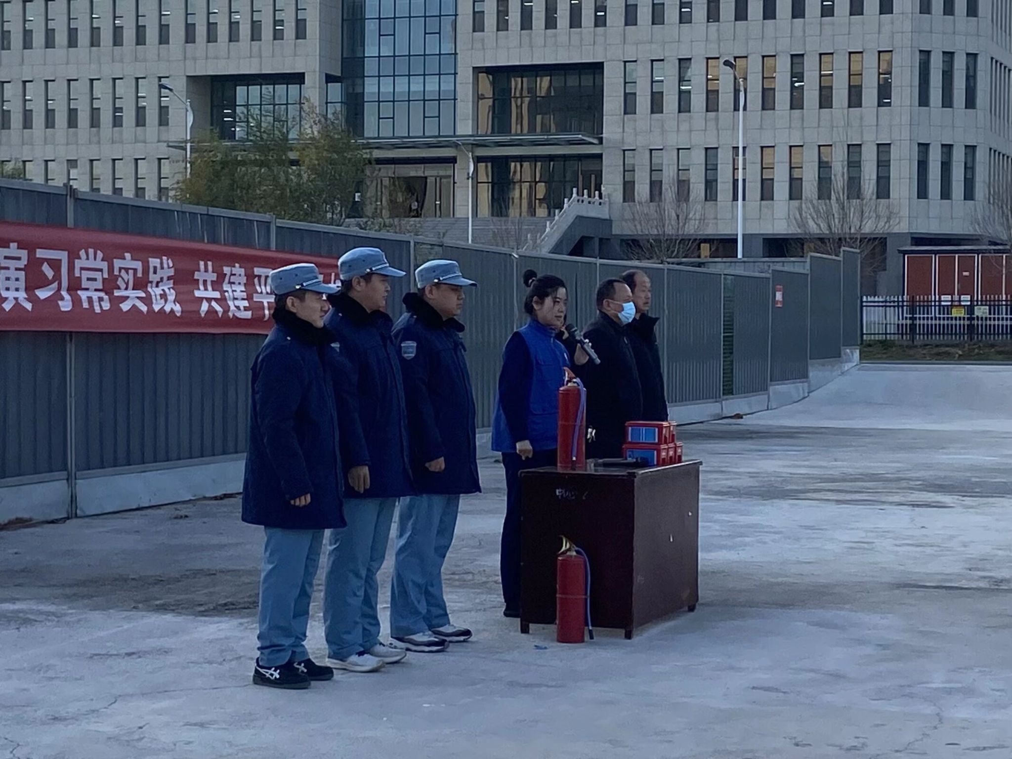 演练开始前,消防队员结合校园实际,详细讲解了灭火器的种类、适用场景及“提、拔、握、压”操作步骤,并演示了防毒面罩的正确佩戴方法,强调浓烟环境中呼吸防护的关键要点。