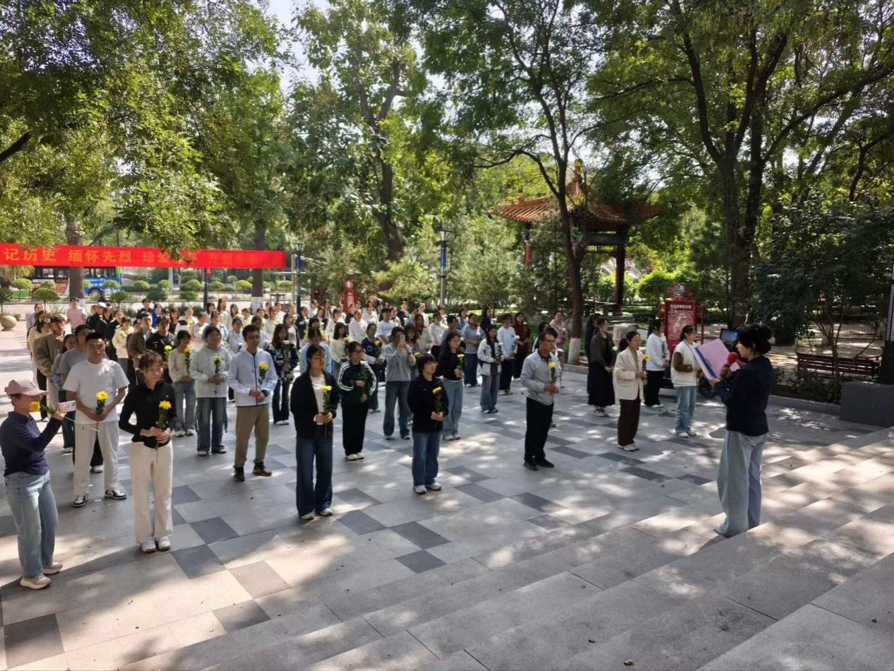 秋日的烈士陵园庄严肃穆,巍然耸立的革命烈士纪念碑在阳光下熠熠生辉。中午12时许,全体师生整齐列队,集体步行至汾阳市烈士陵园。活动在庄严的《中华人民共和国国歌》声中正式开始。随后,现场师生集体肃立,向长眠于此的革命先烈默哀一分钟,表达对英雄的无限哀思与崇高敬意。
