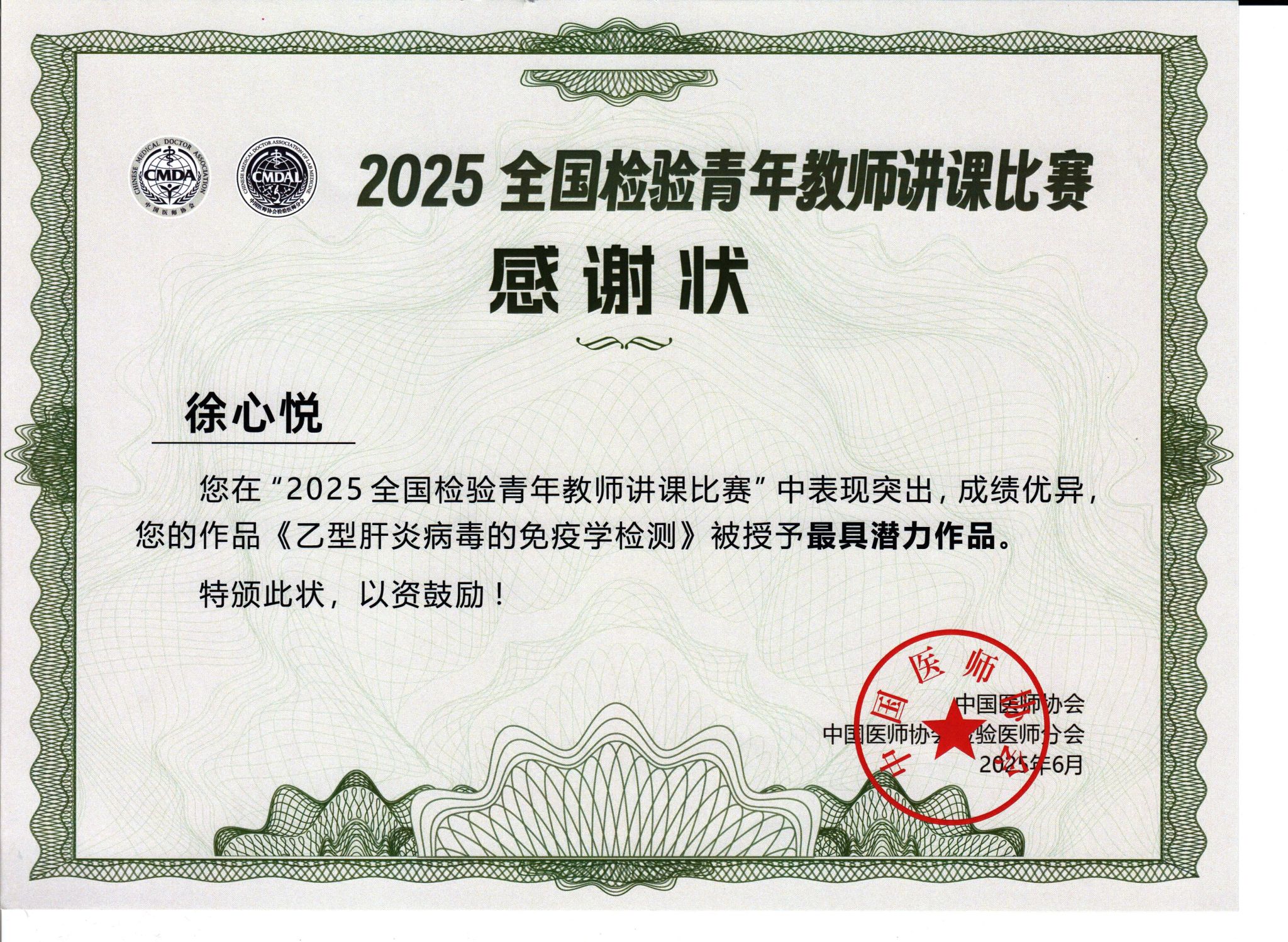 本次全国检验青年教师讲课比赛汇聚了来自全国各地医院和高校的众多优秀青年检验教师,竞争激烈。本次比赛不仅承续了历届全国检验青年教师讲课比赛“以赛促教、以赛促学、教学相长”的核心理念,也进一步加强了多学科交叉融合特色的教育实践,并倡导多样化的检验教学模式,旨在打造 “理论+实践+创新”三位一体的教学交流平台。徐心悦投稿作品《乙型肝炎病毒的免疫学检测》最终荣获“最具潜力作品”奖,彰显了我系部在检验教学领域的蓬勃活力。此次获奖不仅是对徐心悦老师个人教学能力的高度认可,也是我系部长期以来重视教学、鼓励创新的成果体现。